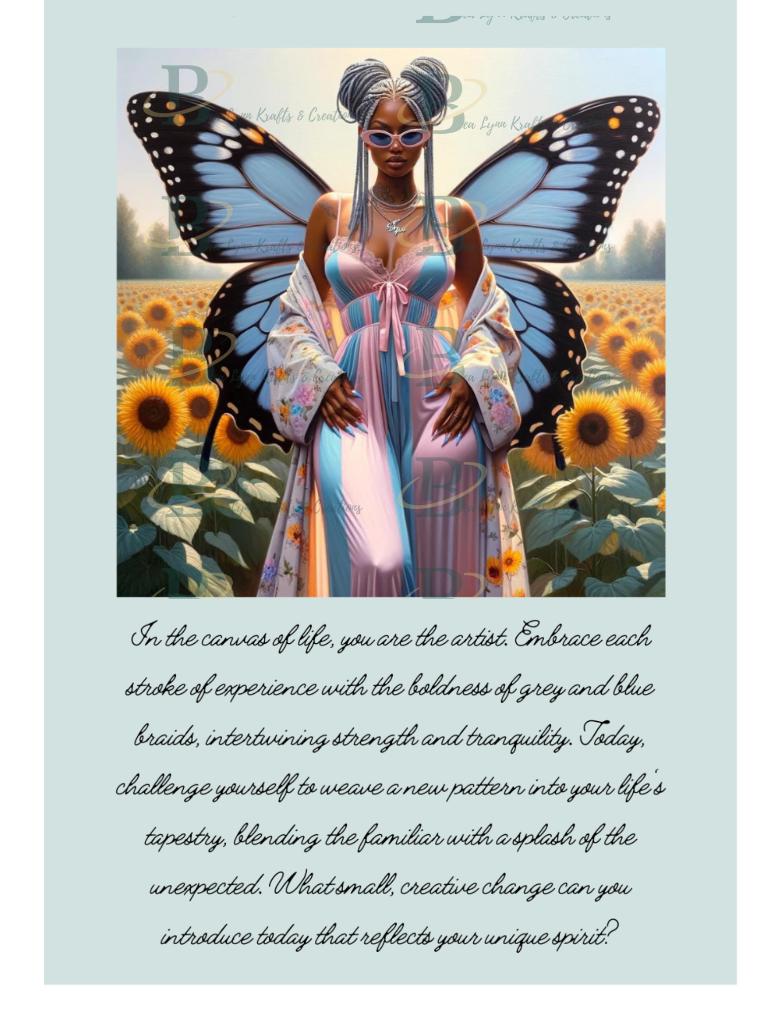 Stunning Artwork: The cards feature exquisite illustrations of African American women as ethereal beings with butterfly wings, symbolizing growth, transformation, and freedom. The sunflower fields add a touch of joy and brightness, enhancing the overall message of positivity.