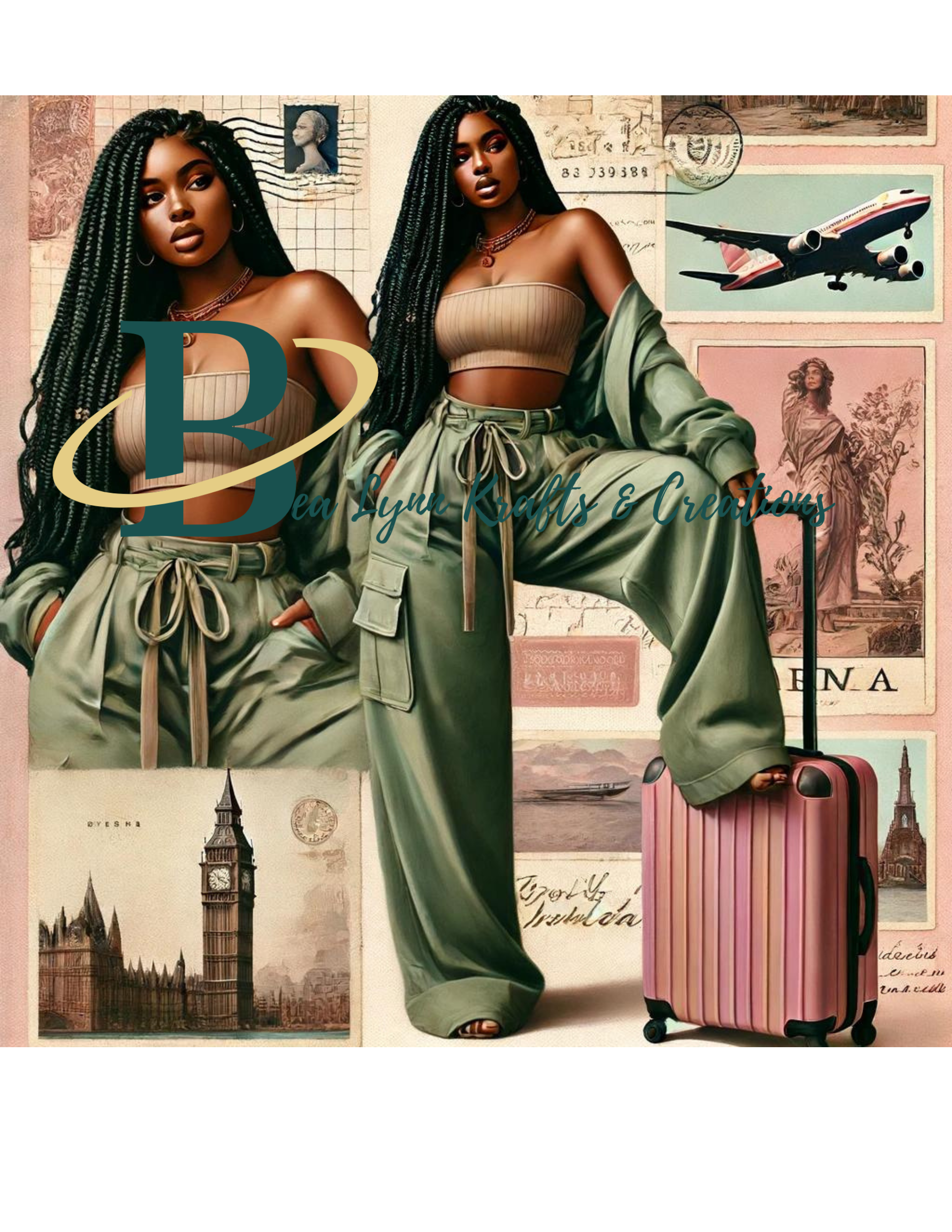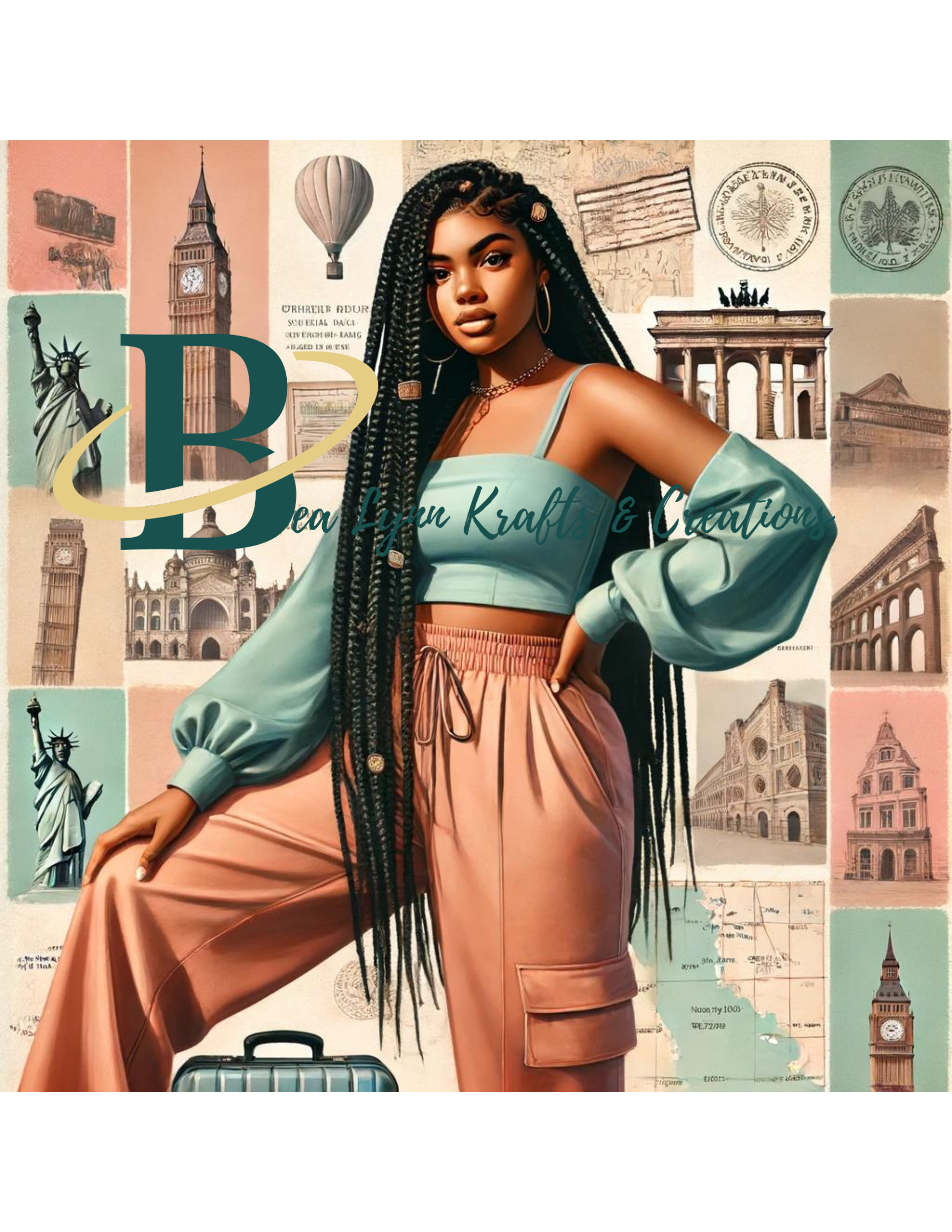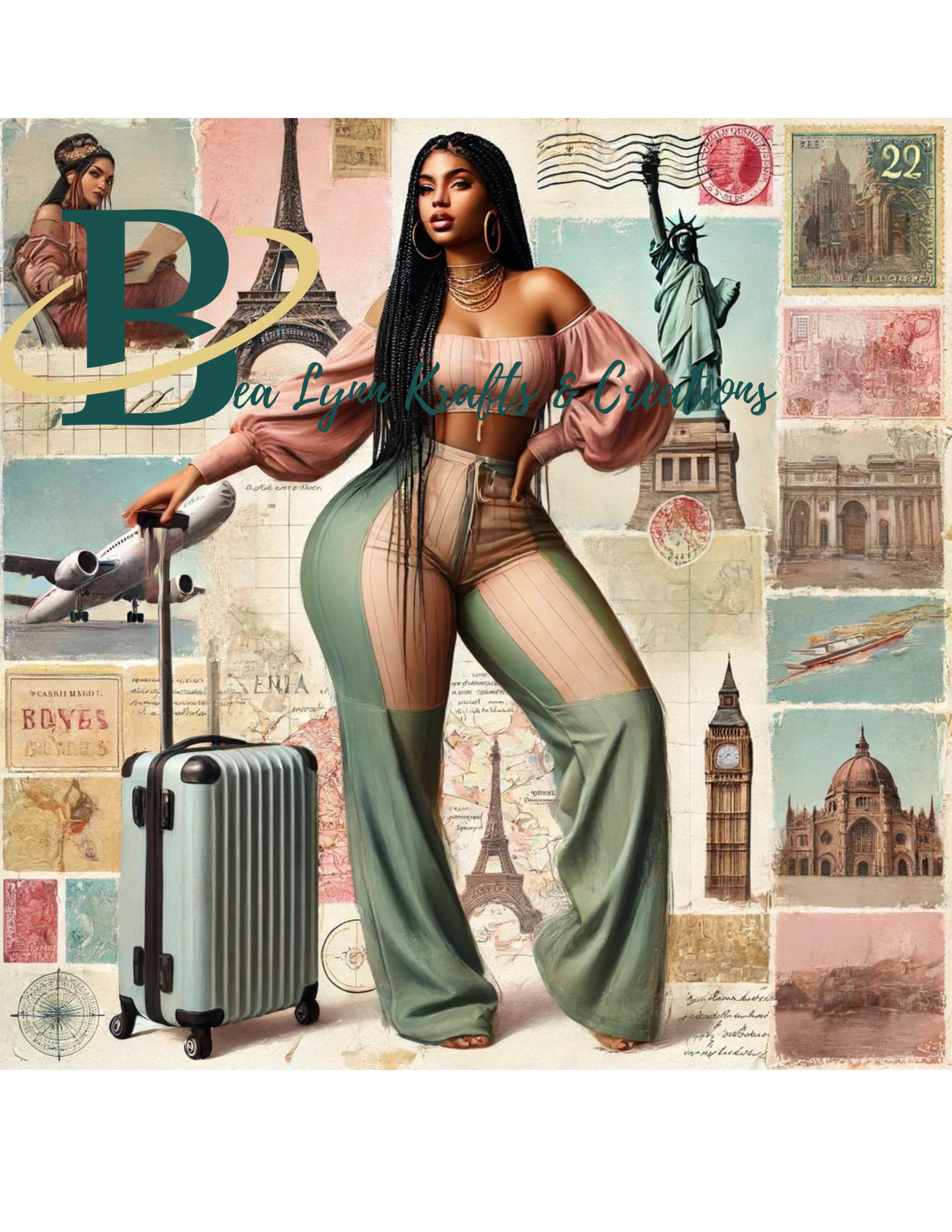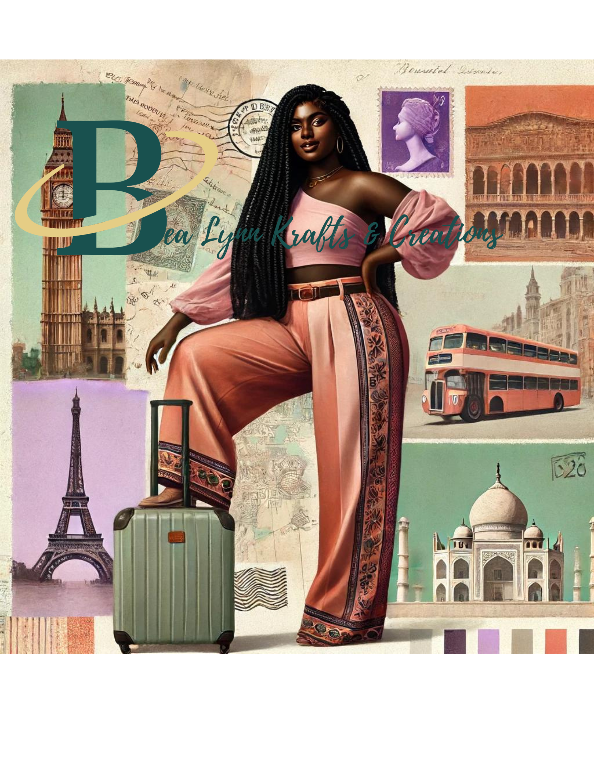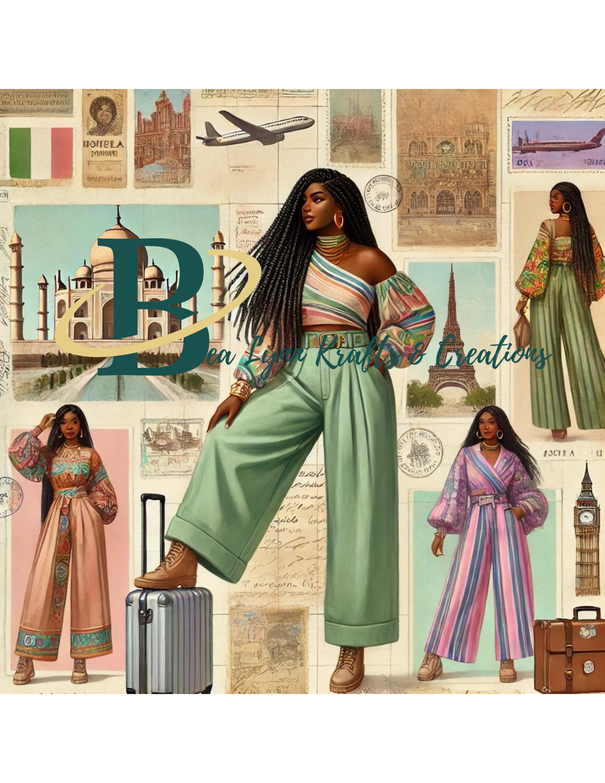 - Vintage Travel Theme: The detailed backgrounds and stylish depiction of the woman add a unique and elegant touch to any project.