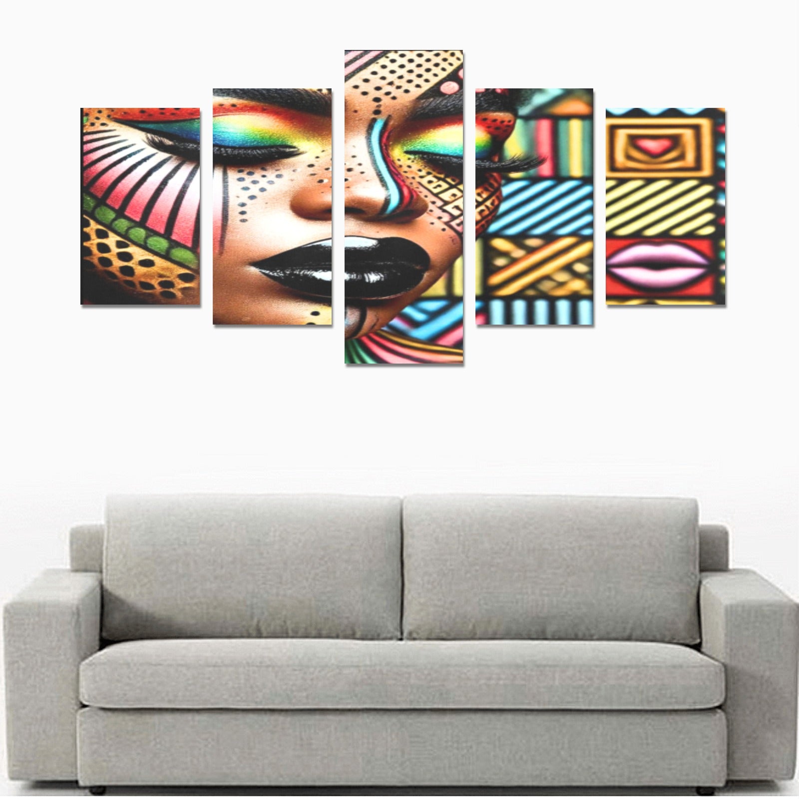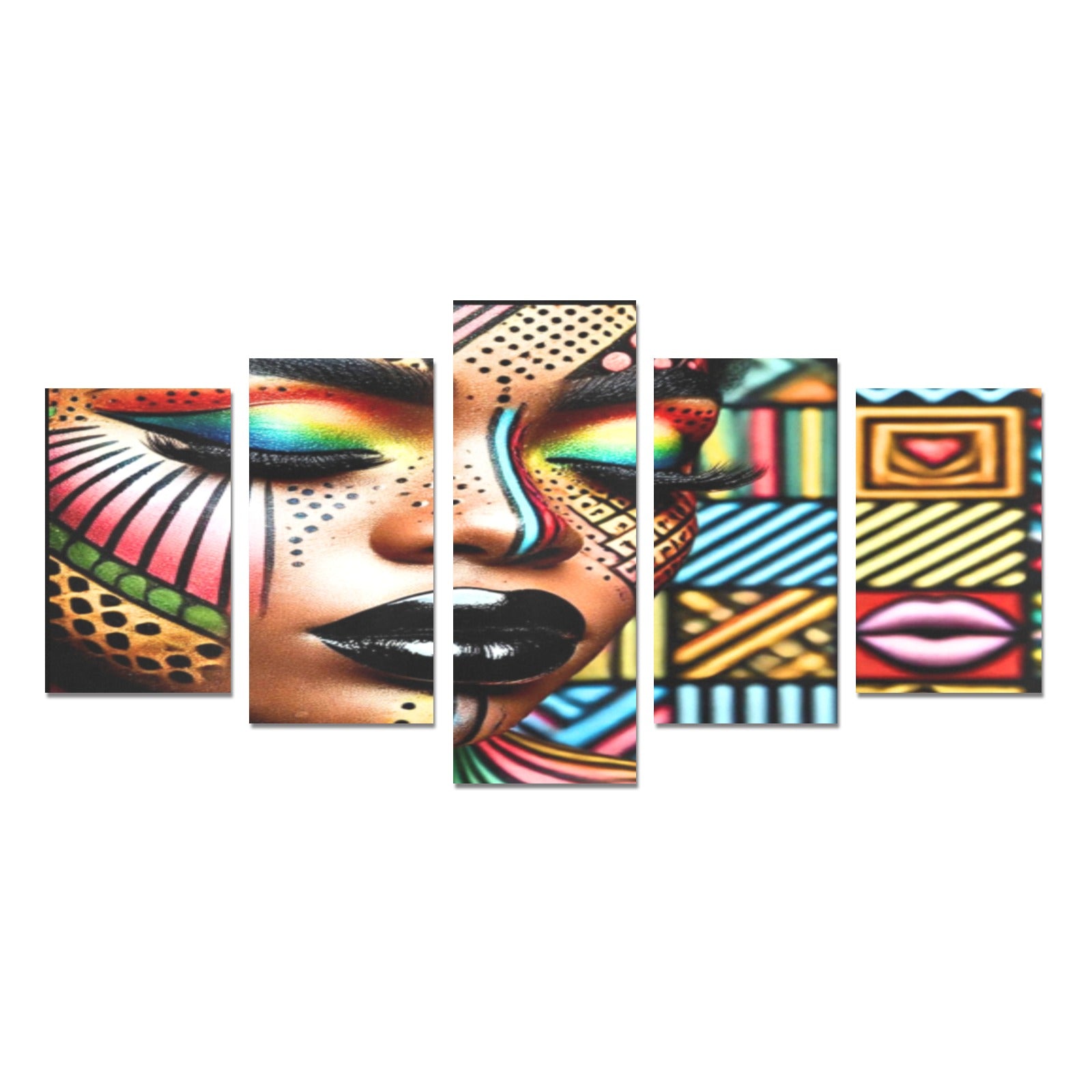 Infuse your home with vibrant energy and cultural flair with this stunning multi-panel canvas art. Featuring a close-up portrait of an African American woman, her face is adorned with a mesmerizing array of abstract patterns and bold, vivid colors. From the rainbow hues of her eye makeup to the intricate geometric designs that frame her serene expression, every detail of this artwork bursts with life and creativity.