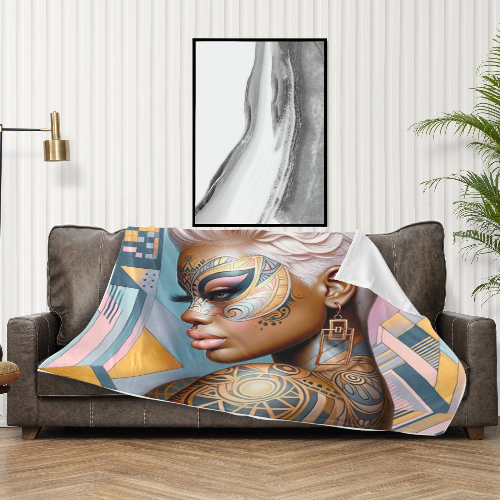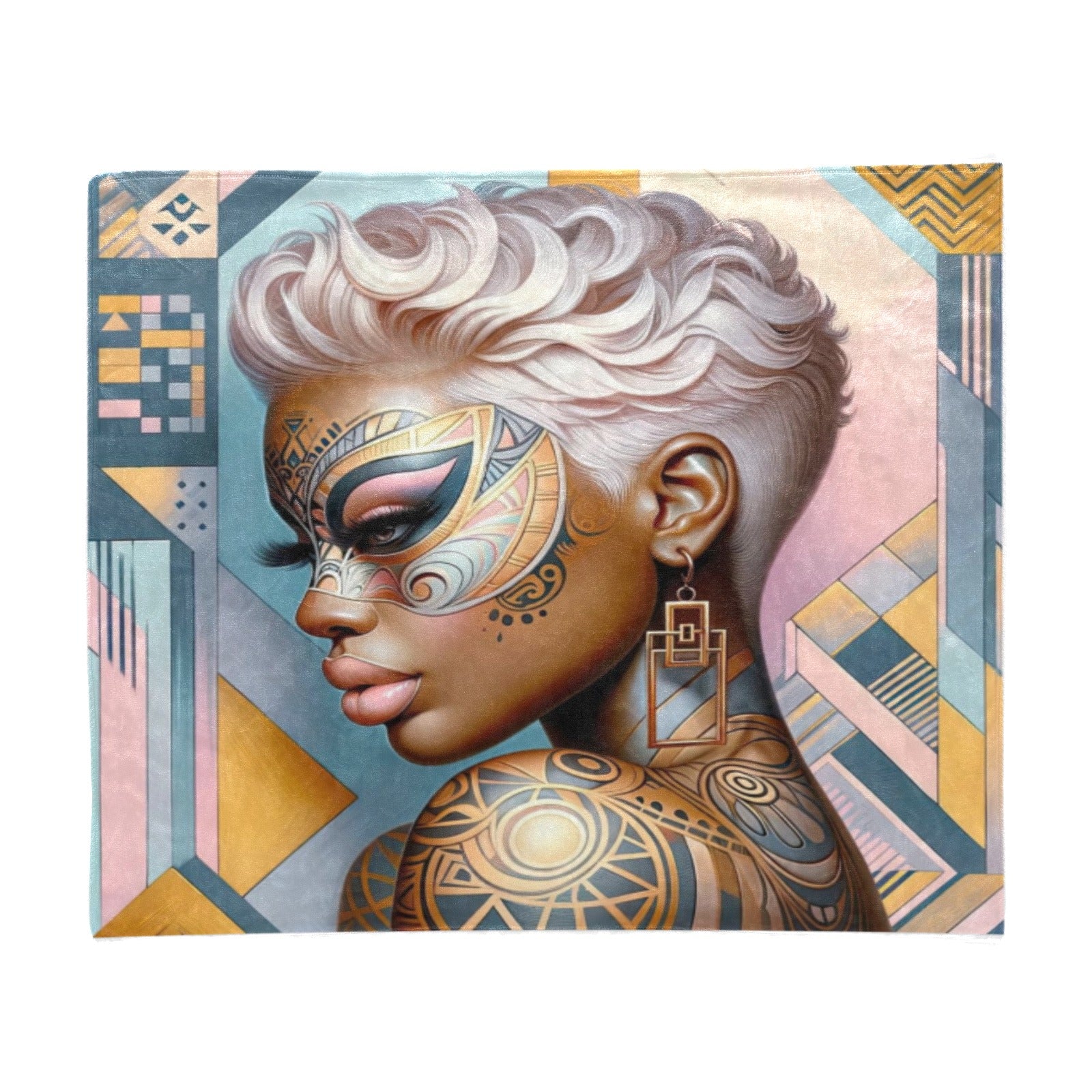 This elegant 60x50-inch throw blanket features a stunning artistic portrait of a woman, blending geometric accents with intricate tribal patterns. The vibrant gold, pastel pink, and muted blue tones create a chic and modern design that adds sophistication to any room. Made from 100% polyester flannel, the blanket is lightweight, durable, and irresistibly soft. It boasts a premium no-fade print for lasting color vibrancy, perfect for those who appreciate unique art and cozy comfort.
