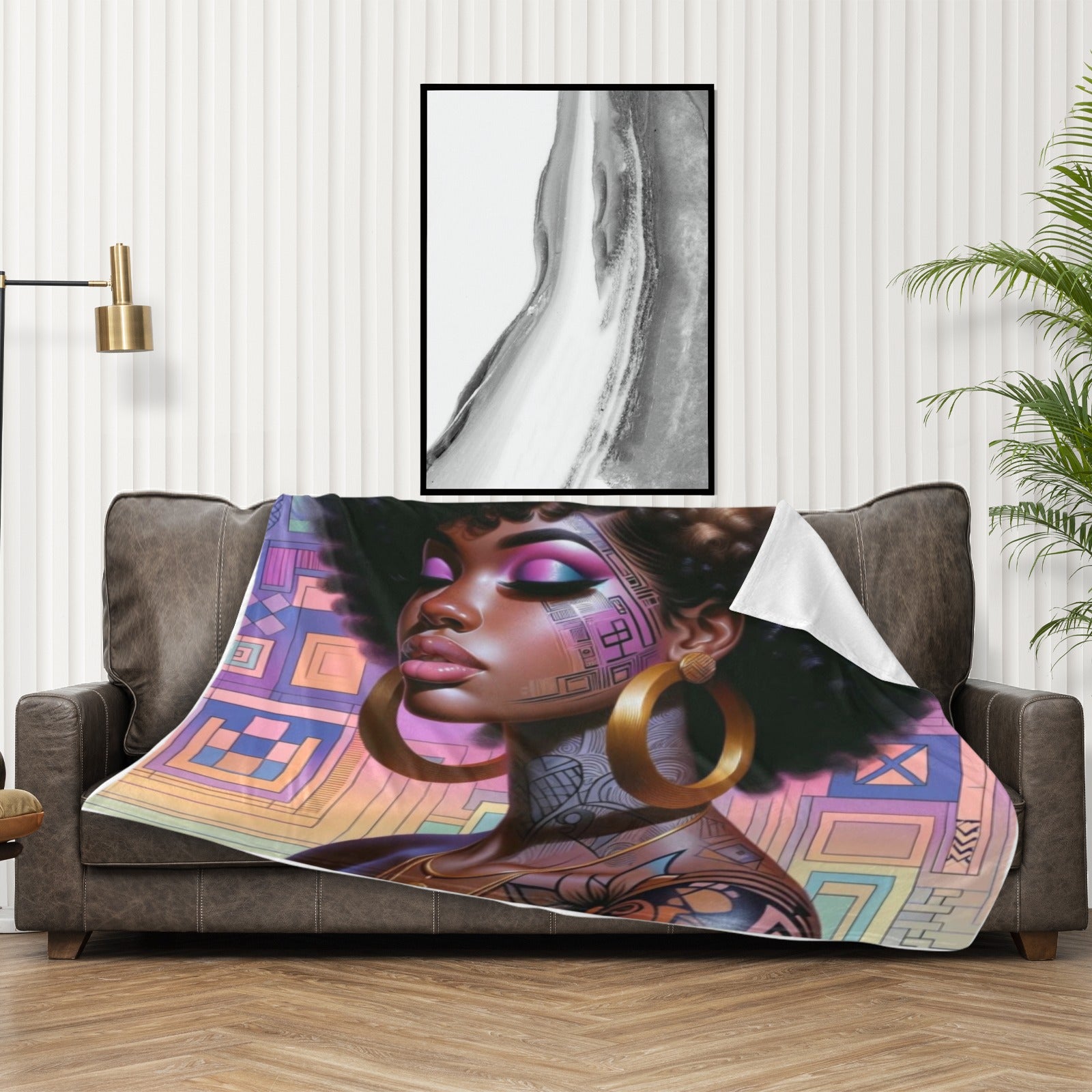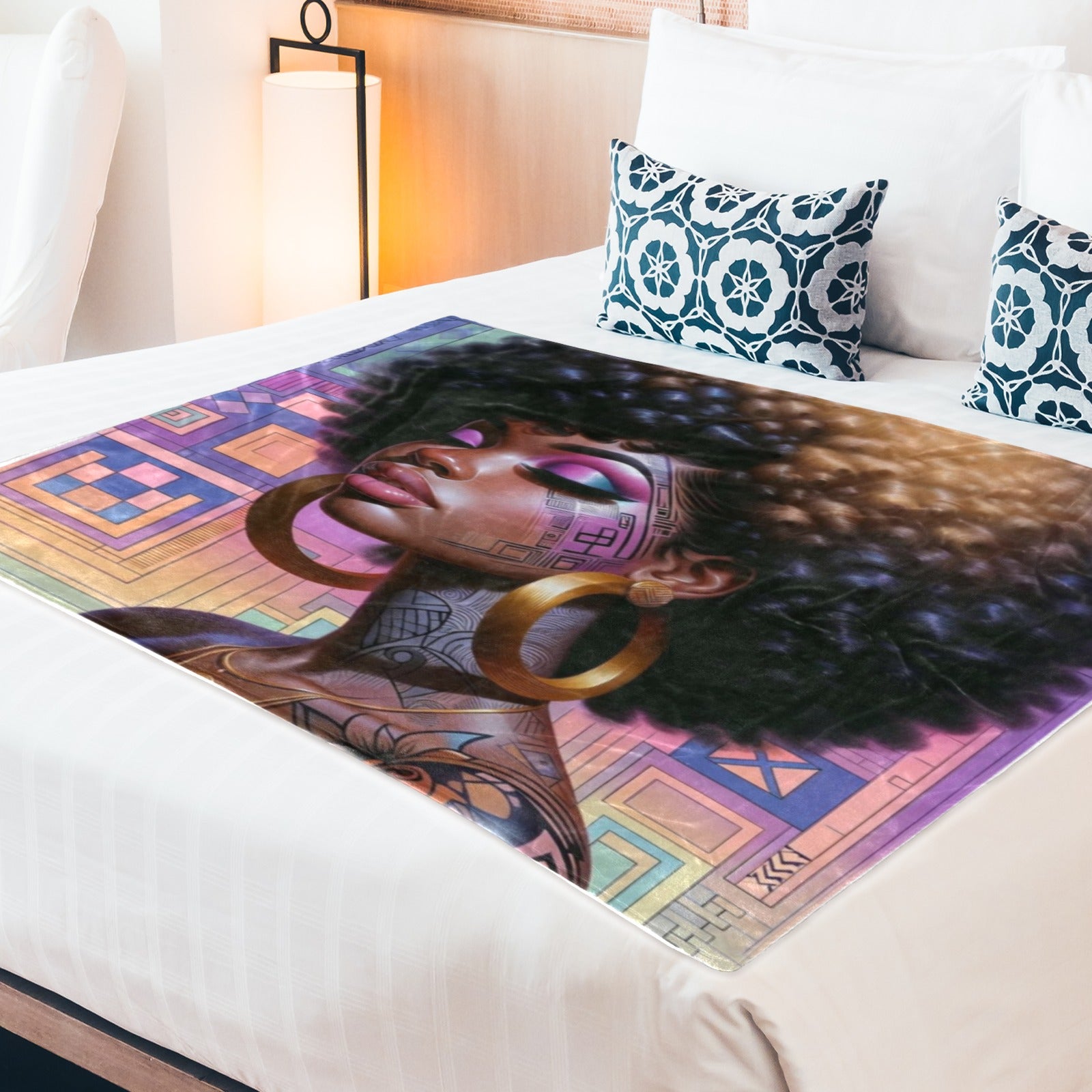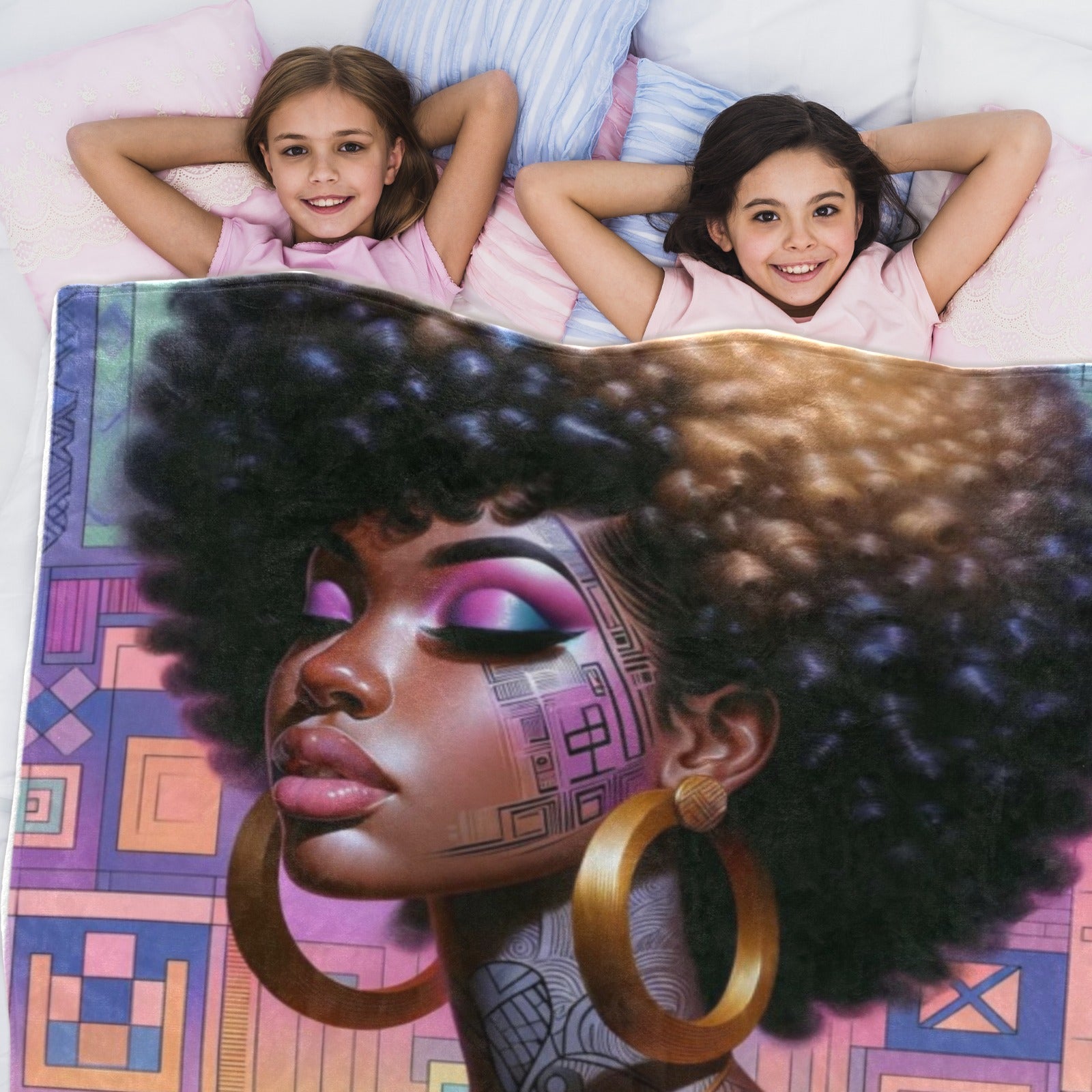 This stunning 60x50-inch throw blanket features a striking portrait of an African American woman adorned with intricate tribal-inspired designs, vibrant makeup, and golden hoop earrings. The rich hues of pink, purple, gold, and blue blend harmoniously with geometric patterns to create a bold and modern statement piece for any room. Crafted from 100% polyester flannel, this blanket is exceptionally soft, lightweight, and warm, perfect for cozying up or adding a splash of personality to your decor.