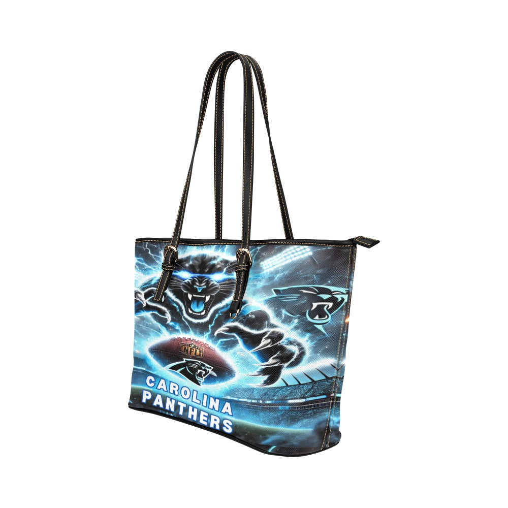 Celebrate your Carolina Panthers pride with this bold and functional leather tote bag! Featuring a dynamic design of the Panthers logo with an electrifying background, this tote is perfect for passionate NFL fans. Made from premium PU leather, it includes spacious compartments with secure zippered closures to keep your essentials organized. Whether it's game day, a casual outing, or daily errands, this tote bag combines style, durability, and team spirit.