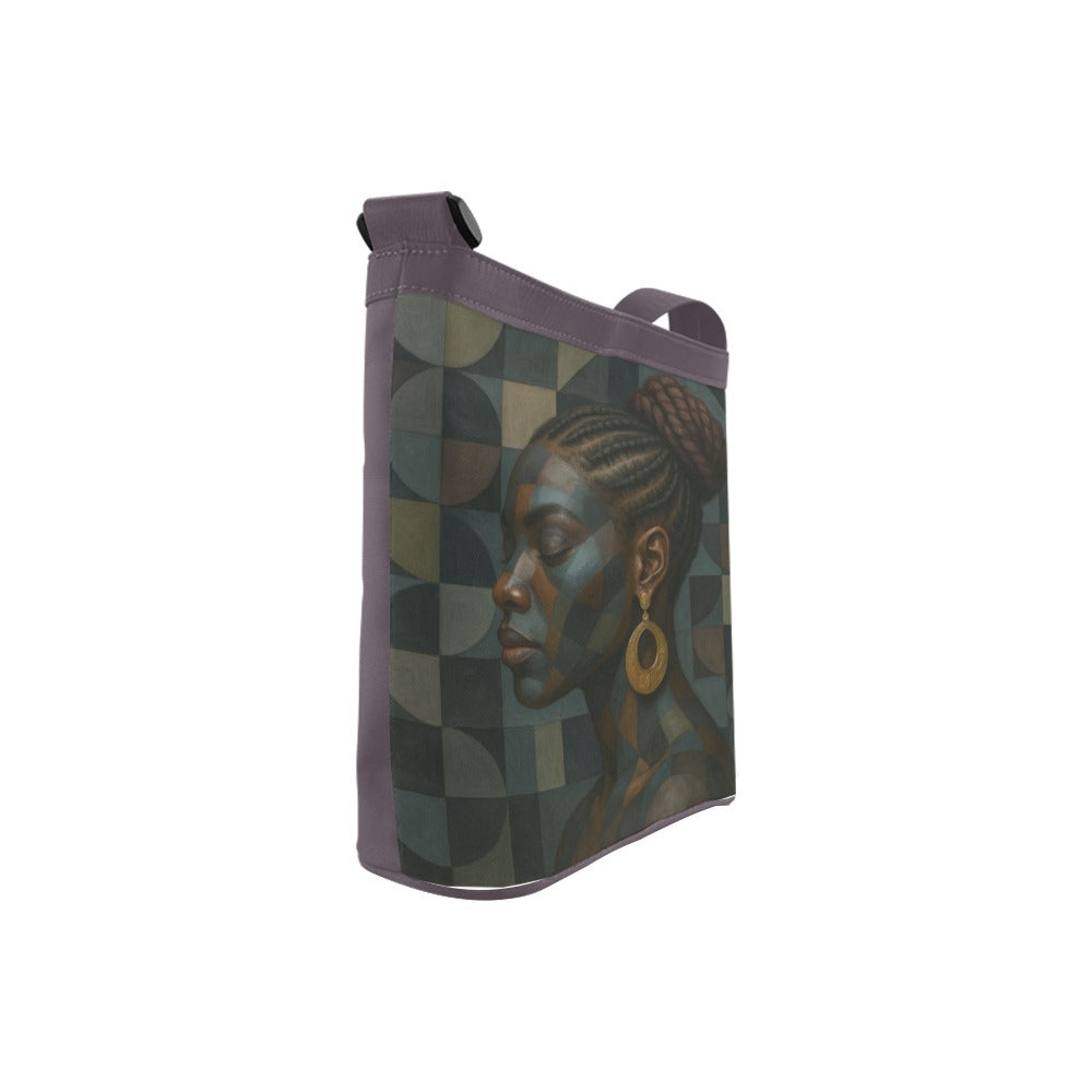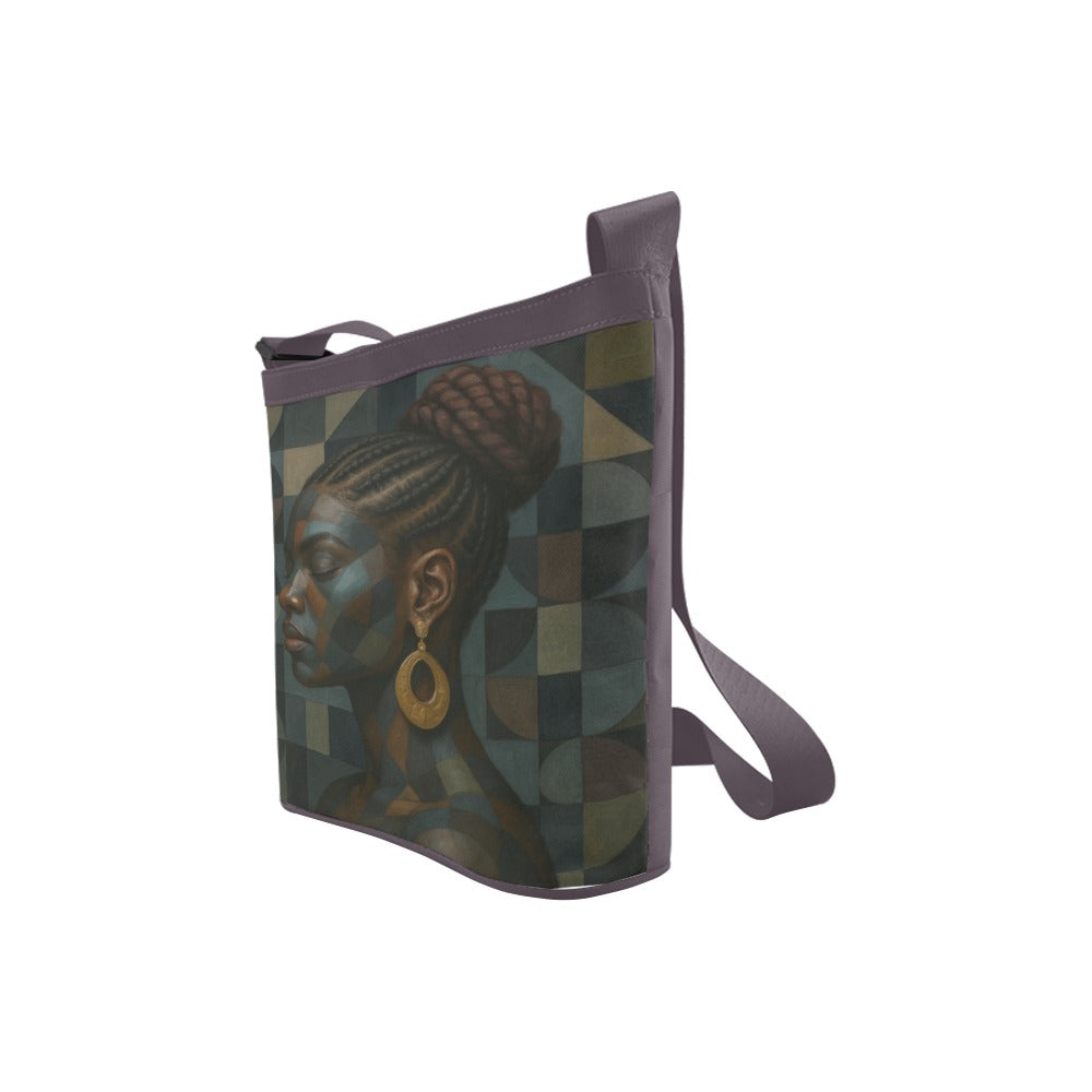 This refined crossbody bag celebrates African heritage through a powerful portrait of a Black woman with neatly braided hair, adorned with golden hoop earrings and wrapped in geometric earth-tone patterns. Her poised profile and closed eyes radiate strength, dignity, and introspection, while the layered patchwork background symbolizes ancestral legacy, cultural continuity, and unity in diversity. This piece transforms functional fashion into a tribute to generational beauty and pride.
