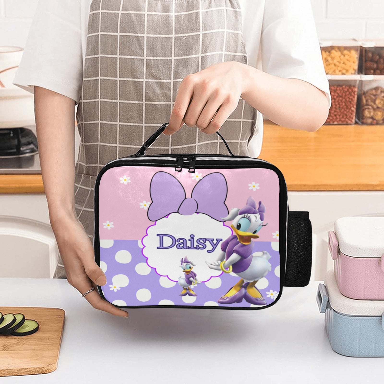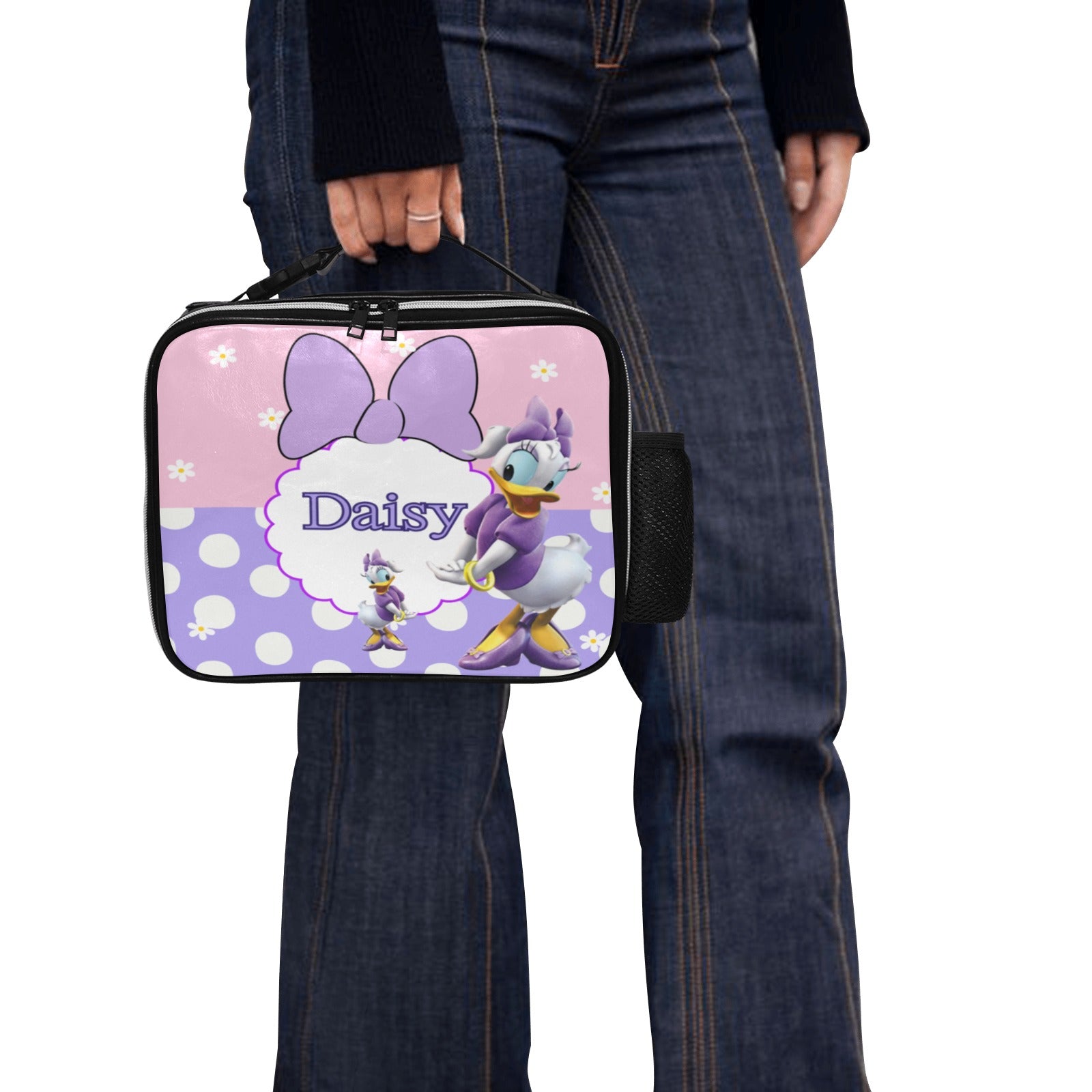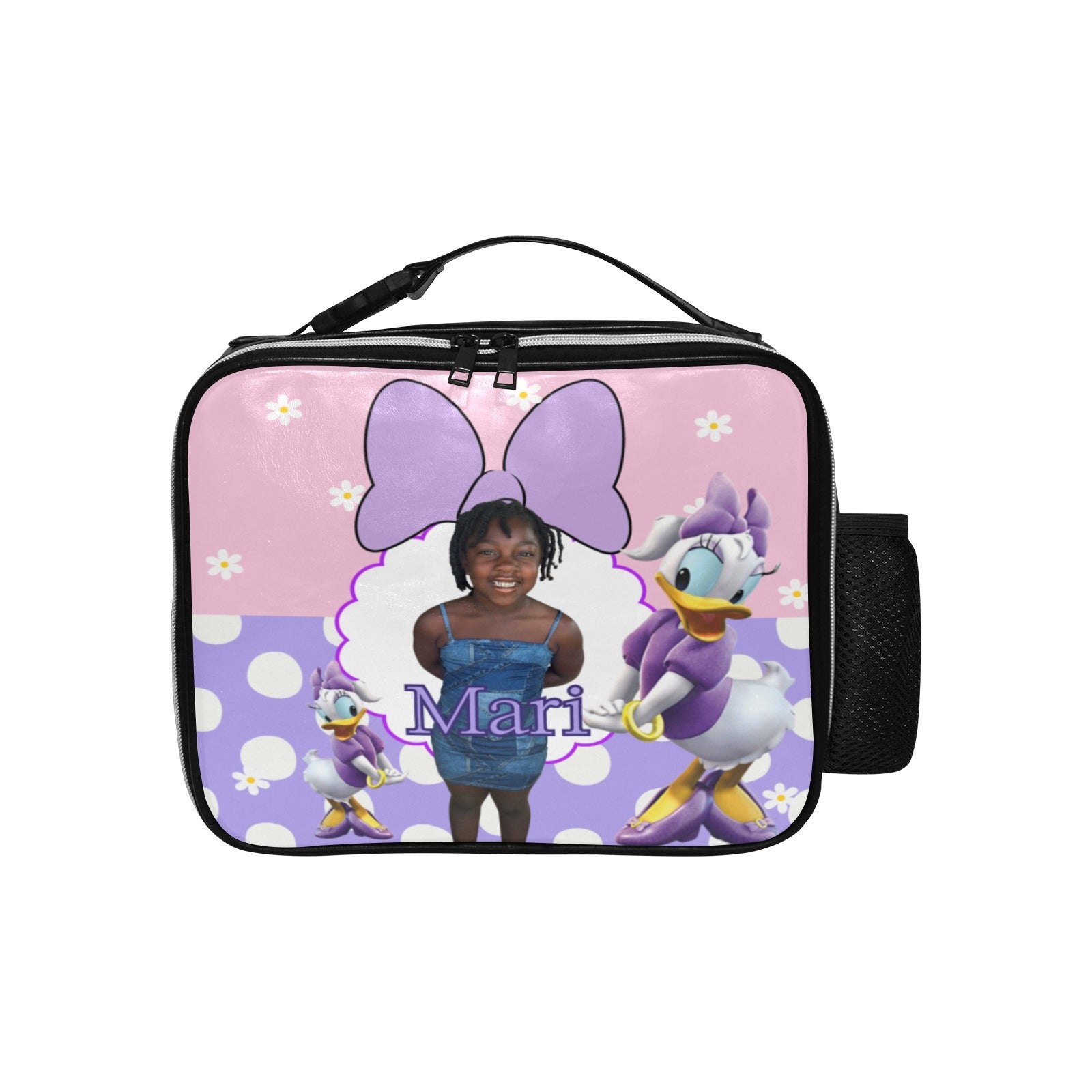 Add a magical touch to lunchtime with our adorable Daisy Duck-themed PU leather lunch bag! This stylish and durable lunch bag can be personalized with your child’s name and photo, making it a one-of-a-kind favorite for school or daycare.