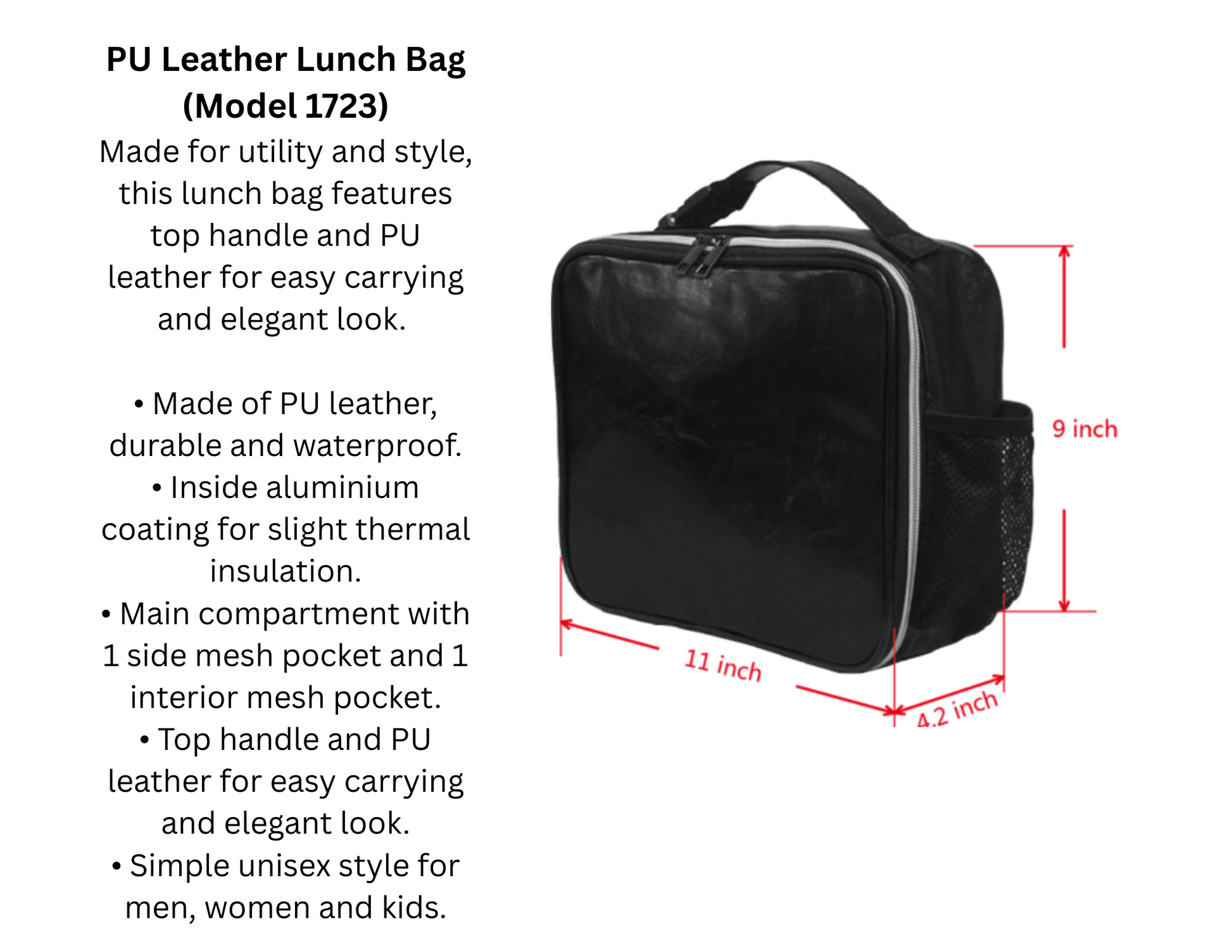 11 in (L) x 9 in (H) x 4.2 in (W) — roomy enough for snacks, drinks, and lunch containers!