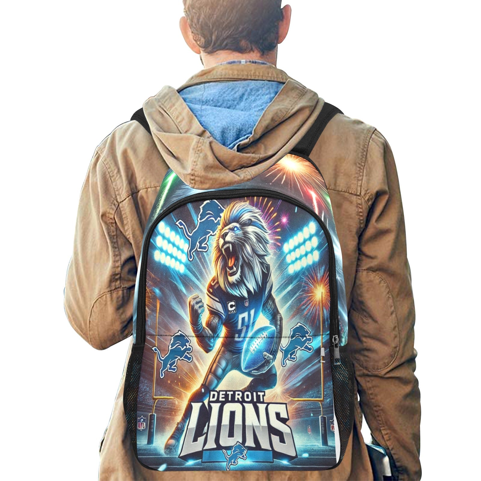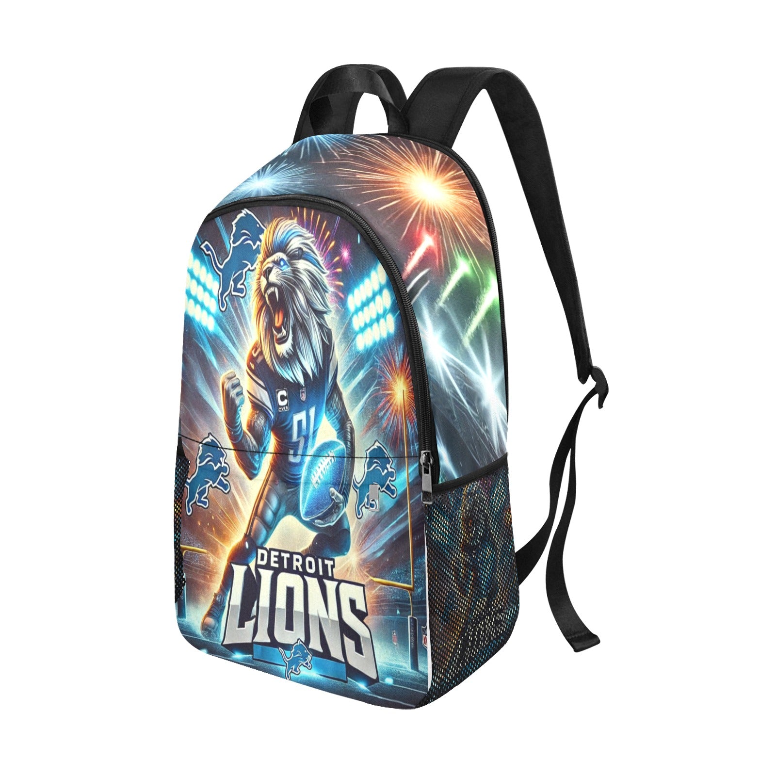 Show your Detroit Lions pride with this dynamic and eye-catching backpack! Featuring a bold and vivid design of a roaring lion mascot, this bag is perfect for die-hard fans who want to stand out. With vibrant colors, football stadium lights, and energetic fireworks, this backpack is a true representation of team spirit.