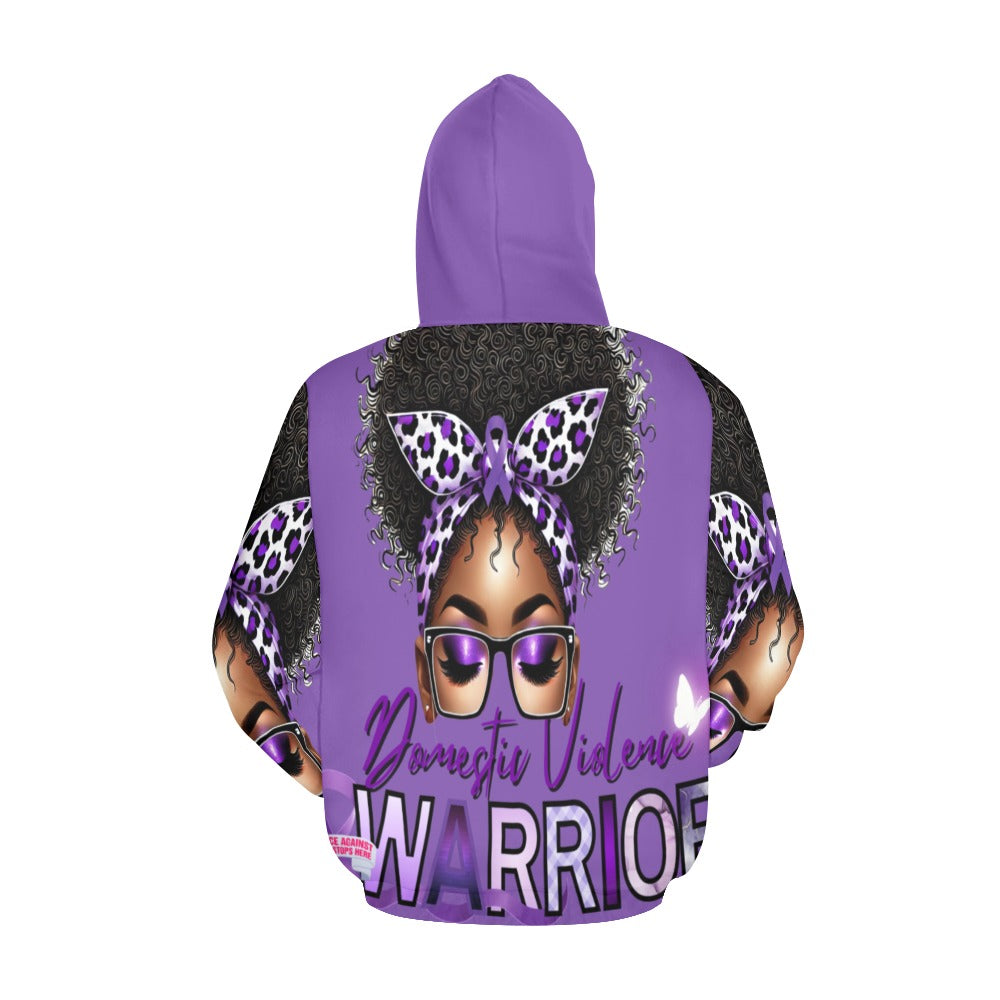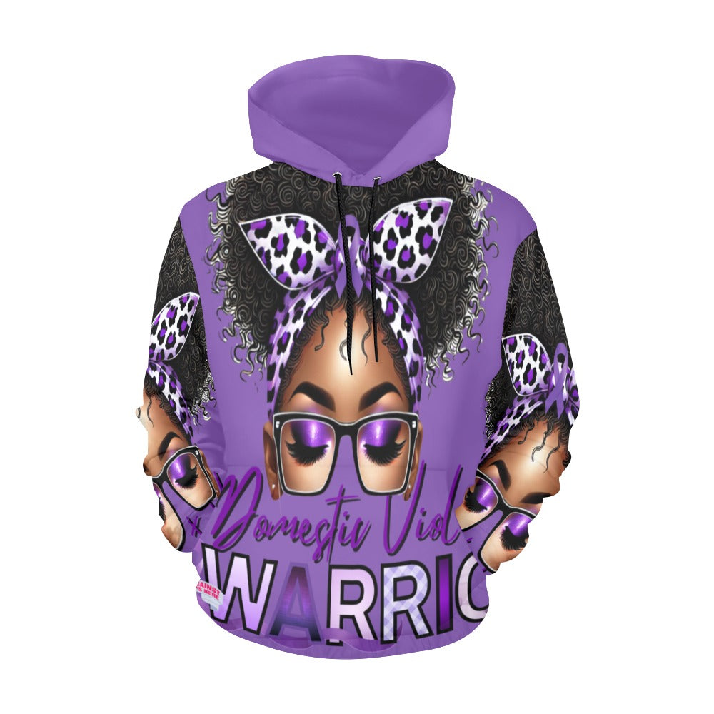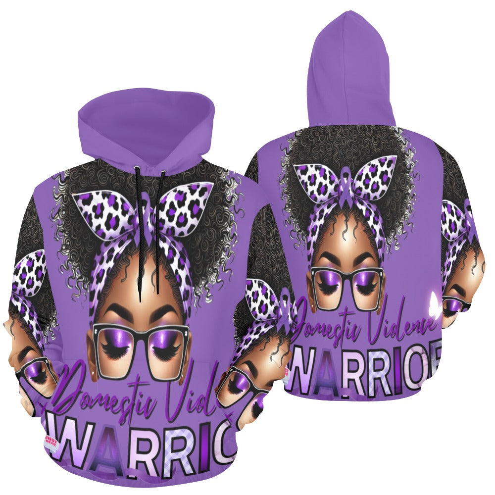 Stand strong and raise awareness with this powerful "Domestic Violence Warrior" women's hoodie. Designed to empower and support survivors, this hoodie features a bold, Afro-American woman with natural curls and a purple leopard print bandana, symbolizing resilience and strength. The prominent purple ribbon, a universal symbol for domestic violence awareness, stands out as a message of hope and solidarity. With vivid purple accents and empowering text, this hoodie is not only a statement piece but also a way to show your commitment to ending domestic violence.