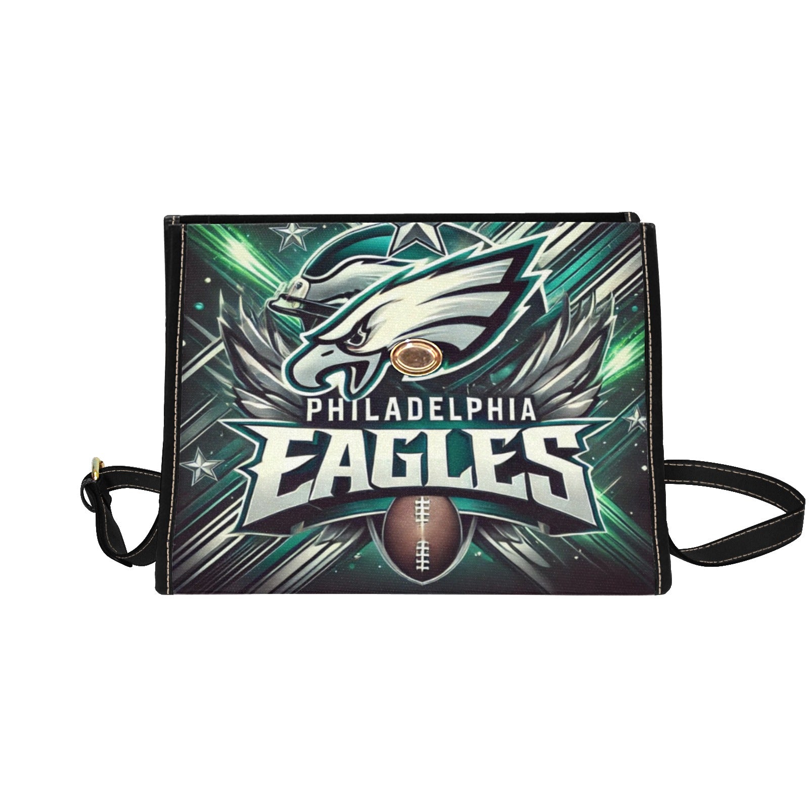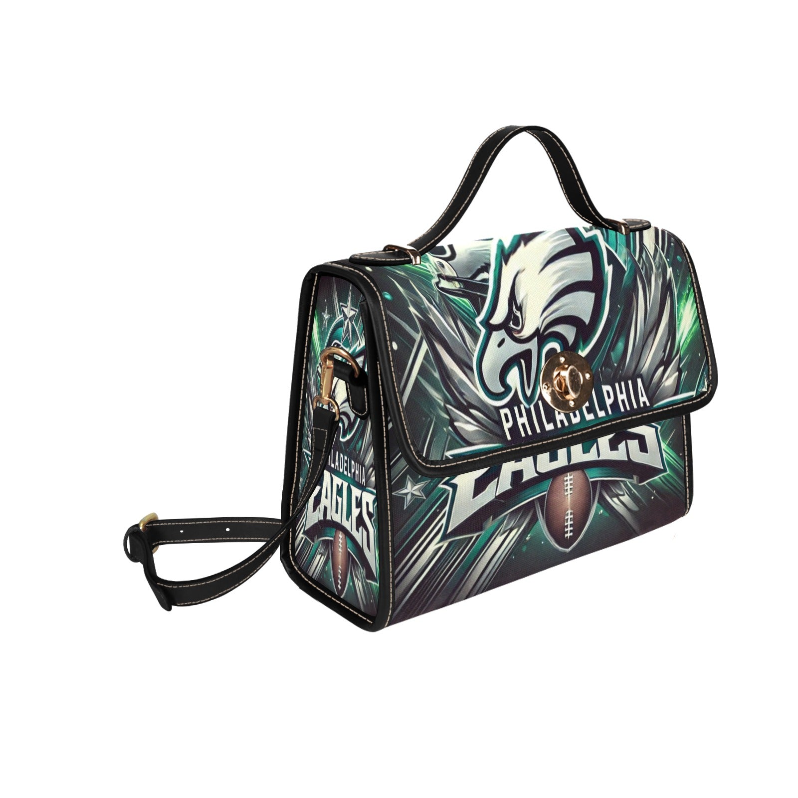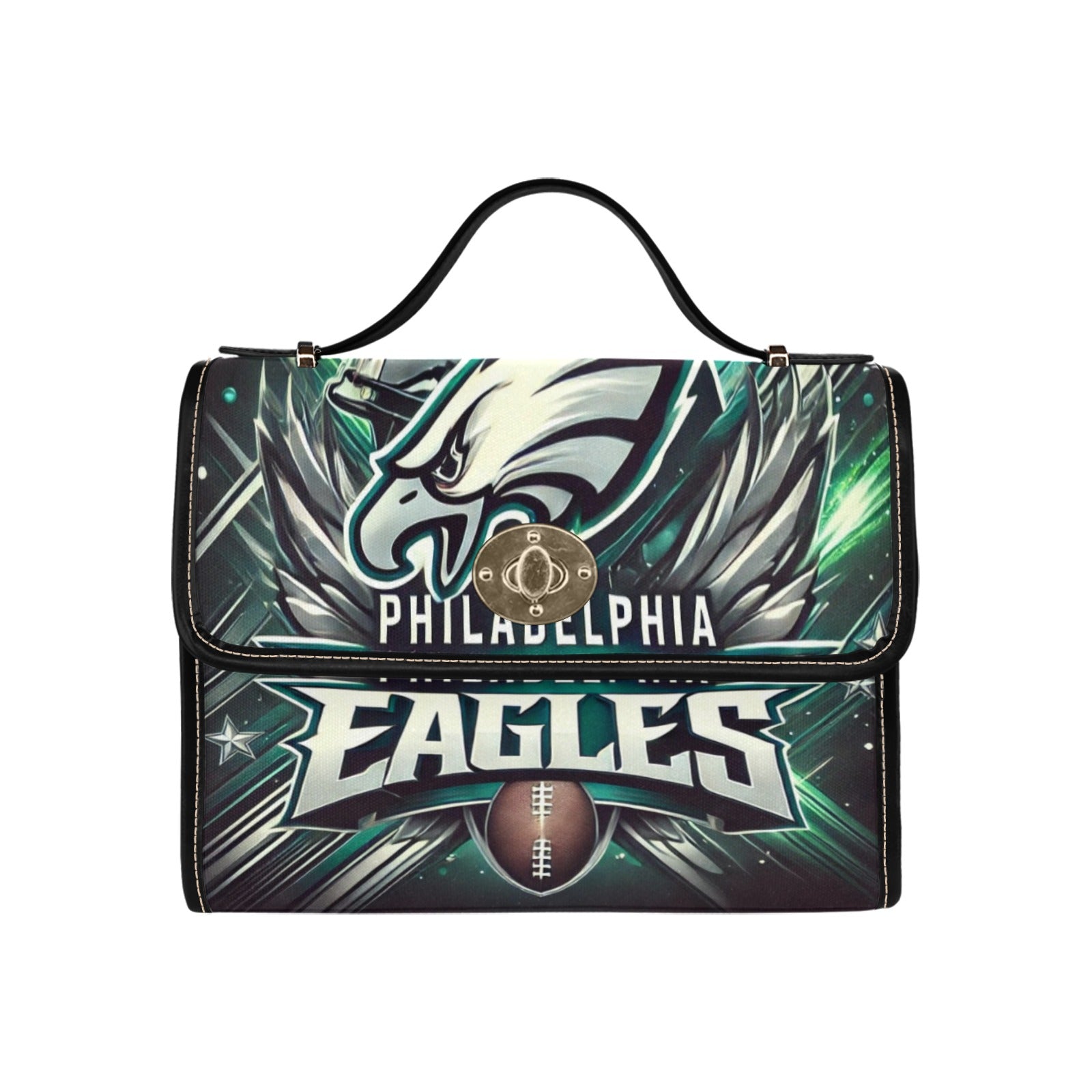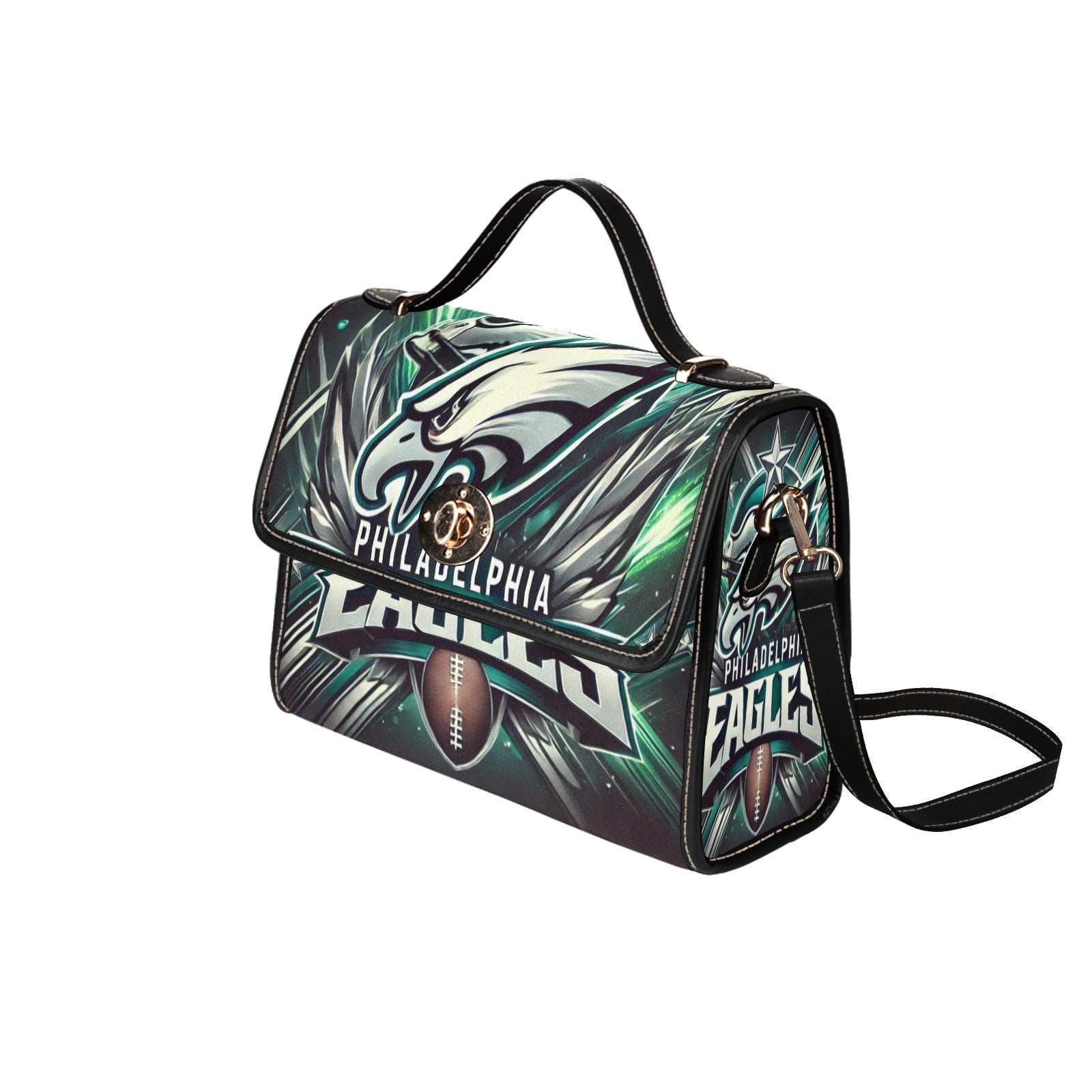 Elevate your game-day style with this sleek Philadelphia Eagles waterproof canvas bag. Designed for durability and elegance, this bag features high-grade waterproof canvas material with a bold Eagles logo and graphics that stand out. It includes two interior pockets and one zipper pocket, perfect for organizing small items while on the go. The bag is accented with double PU leather handles and an adjustable, removable PU leather shoulder strap for versatility in carrying. Whether you’re heading to the stadium, running errands, or out for the day, this compact yet spacious bag offers both style and functionality.