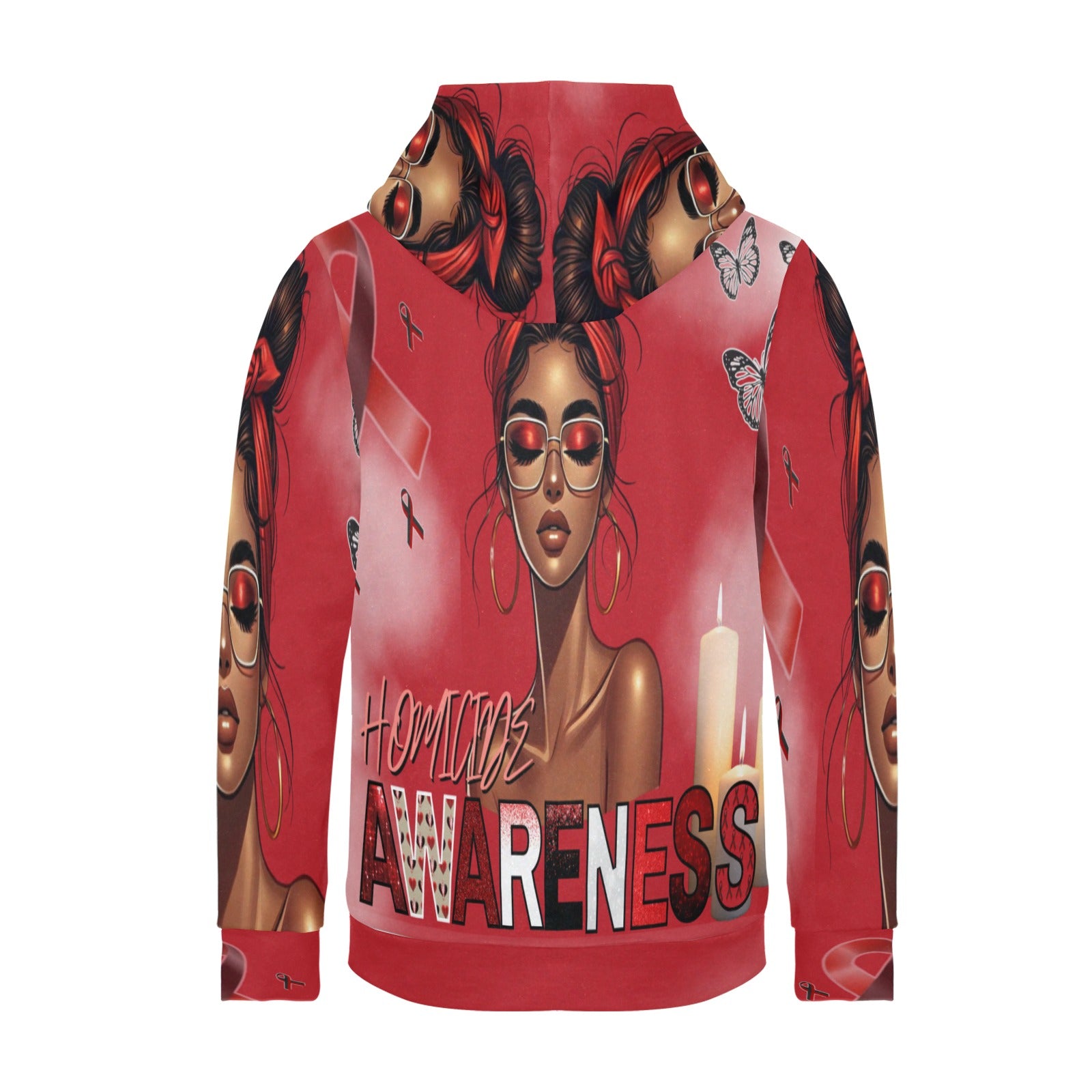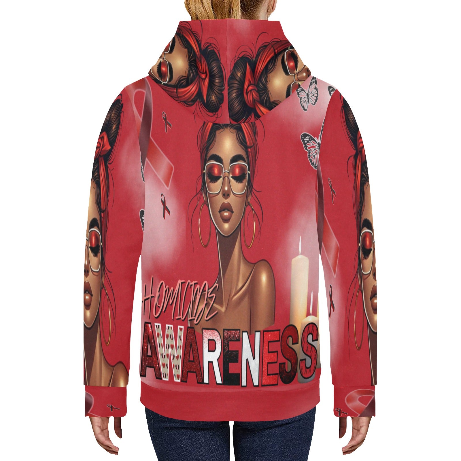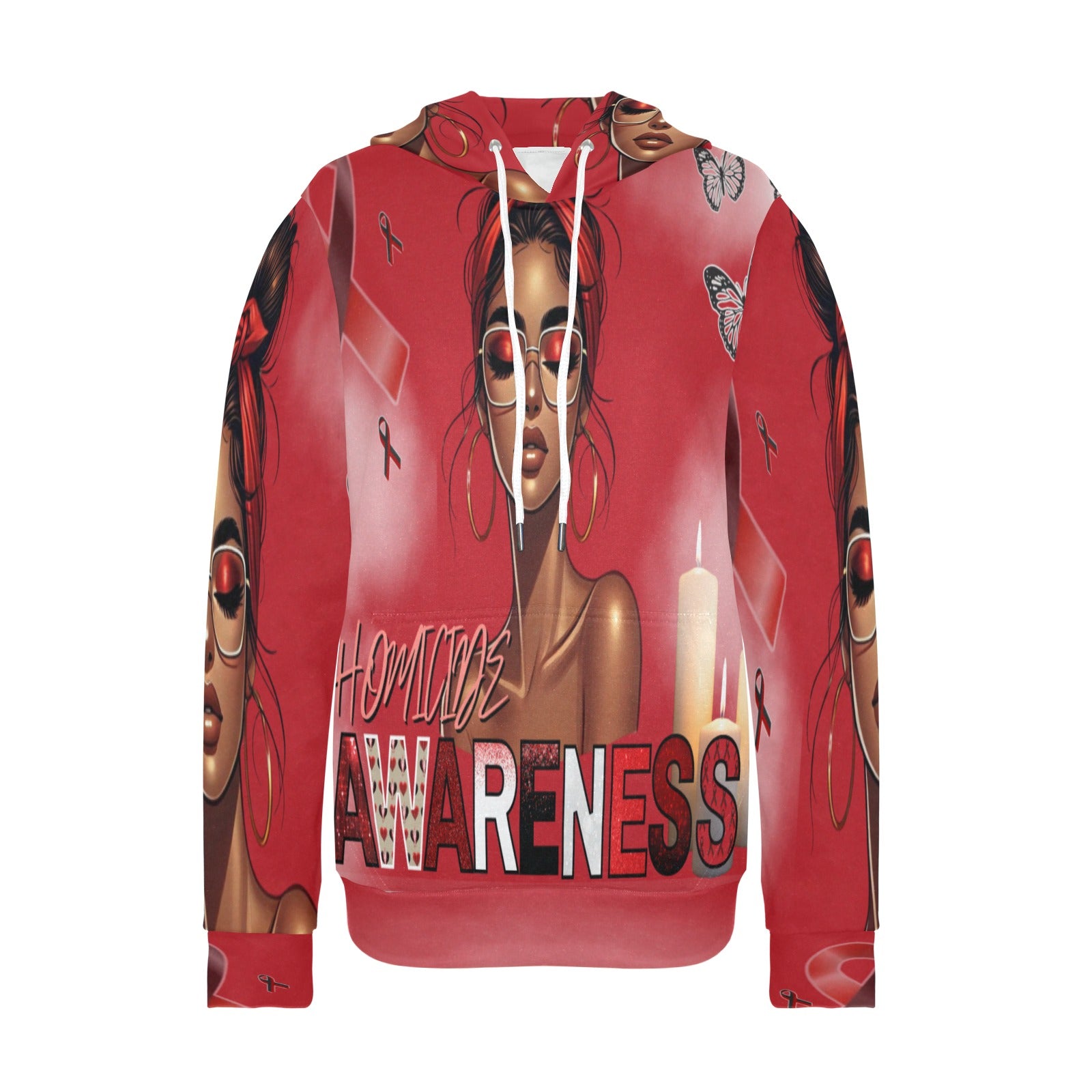 This powerful Homicide Awareness fleece hoodie is more than just a piece of clothing—it’s a tribute to those whose lives have been tragically cut short and a call to action for all of us to remember and raise awareness. The design features a striking image of a woman with red accents symbolizing love, loss, and the urgency of this cause. The red ribbons and candles represent the memories of those lost, while the butterflies symbolize hope and the transformation we strive for in a world free of violence.