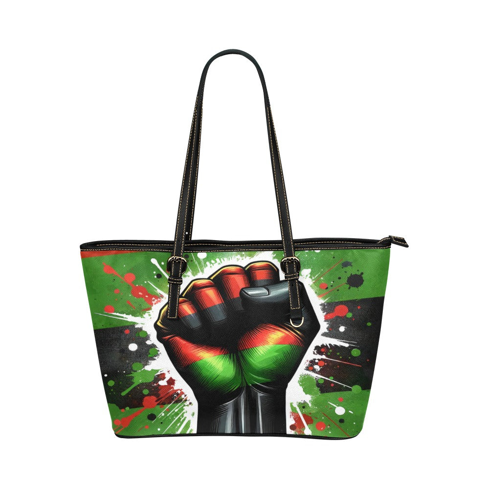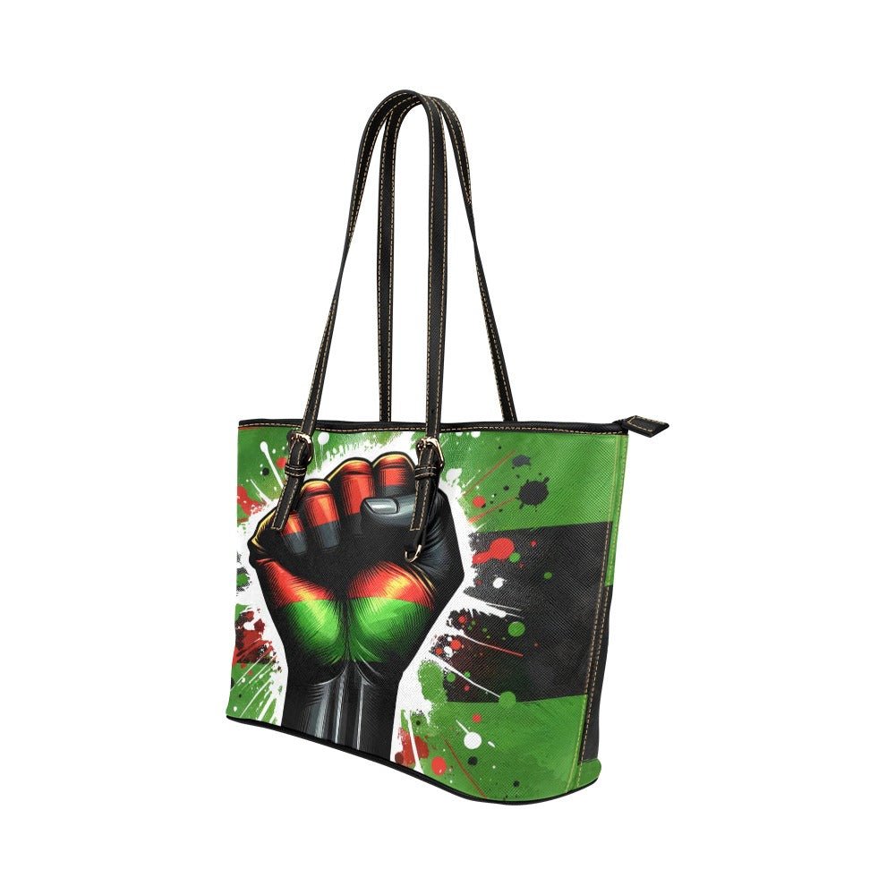 Celebrate culture and heritage with this Juneteenth and Black History-inspired leather tote bag. Featuring a powerful raised fist design with vibrant Pan-African colors, this bag symbolizes strength, pride, and unity. Made from durable PU leather, it offers a spacious interior with an inner zipper pocket and two slip pockets for organization. The bold design and sturdy construction make it perfect for everyday use or as a statement piece for special occasions.