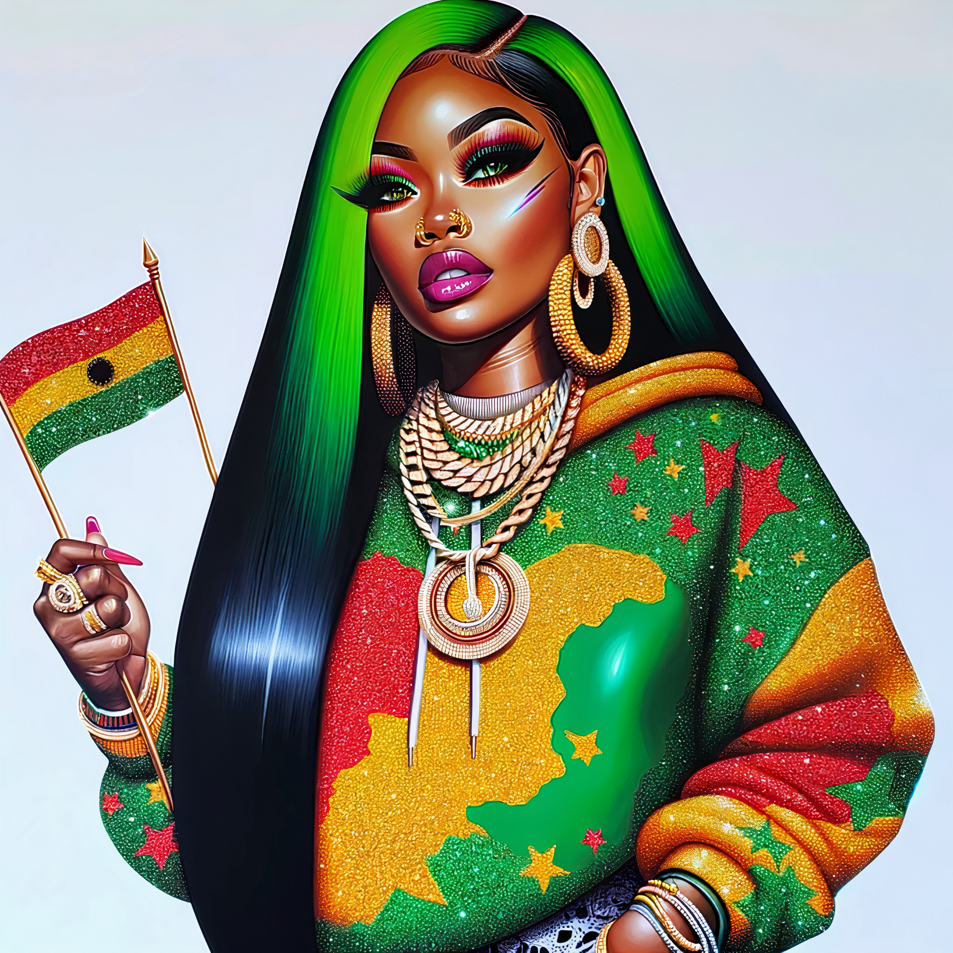 Celebrate Juneteenth with this vibrant and empowering art print that beautifully captures the essence of African heritage and pride. This striking piece features a confident, strong woman adorned in bold red, green, and gold hues, symbolizing the Pan-African flag. Her radiant presence is accentuated by her stylish hoodie showcasing the African continent, complemented by intricate jewelry and makeup that reflects cultural richness.