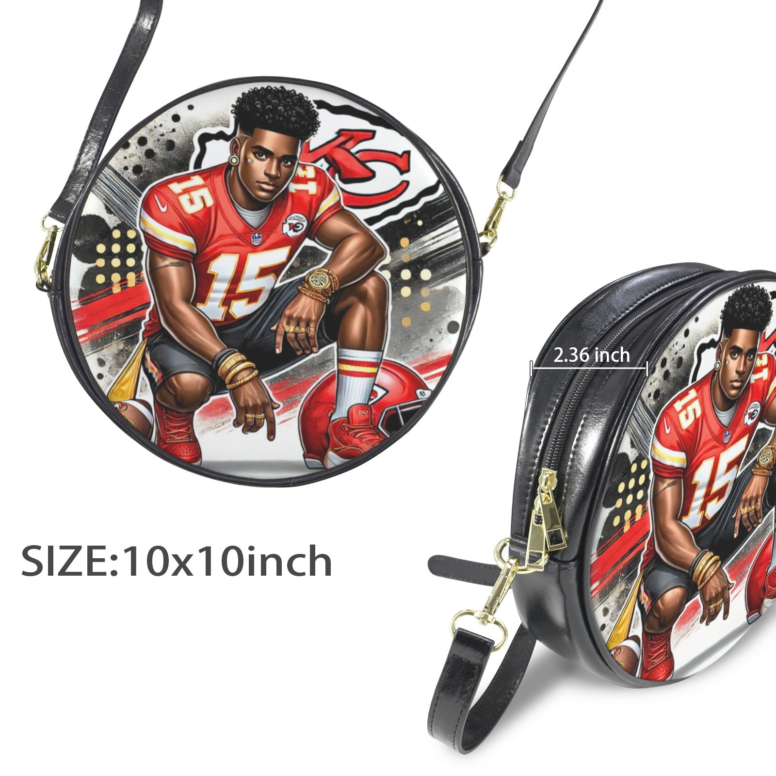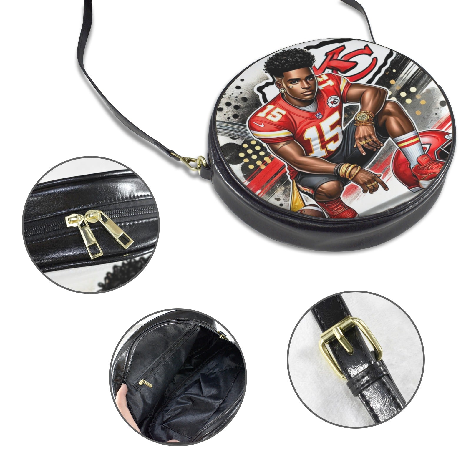 Turn every step into a touchdown with this fire-packed Kansas City Chiefs Round Sling Bag featuring the dynamic #15 front and center! This 10x10 statement piece oozes championship swagger, from the confident pose to the electrifying backdrop. It’s the perfect everyday accessory for die-hard fans who roll with heart, hustle, and Mahomes magic.
