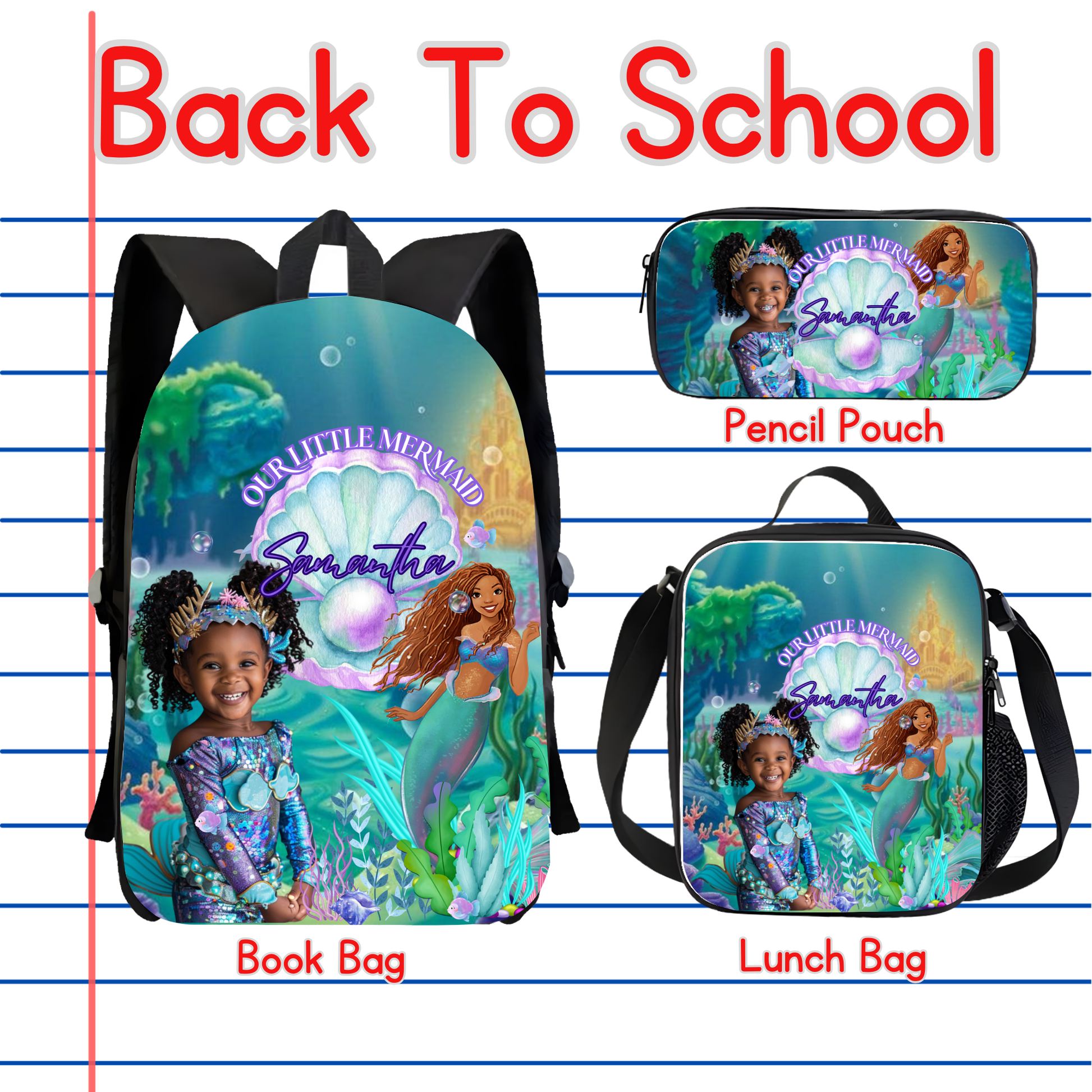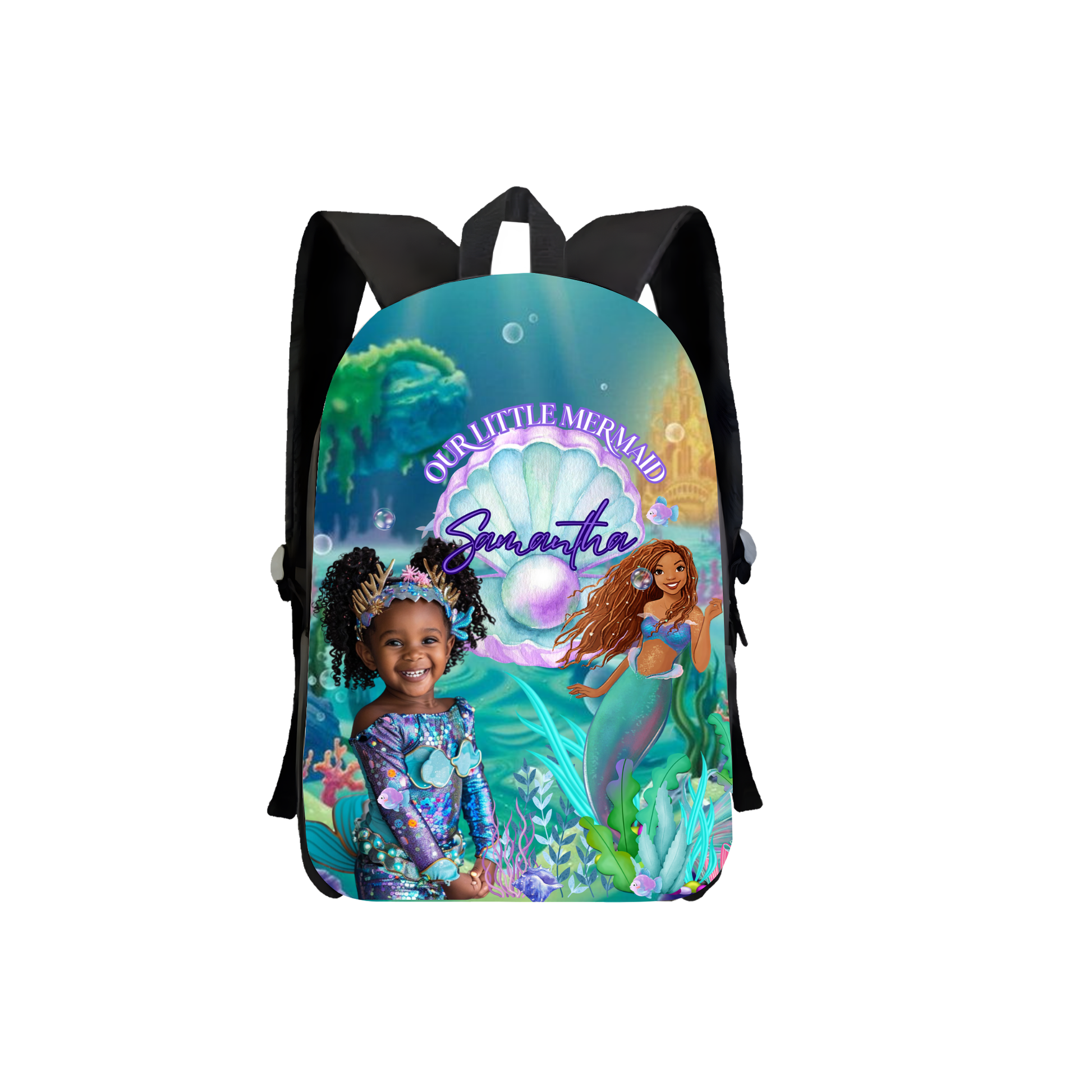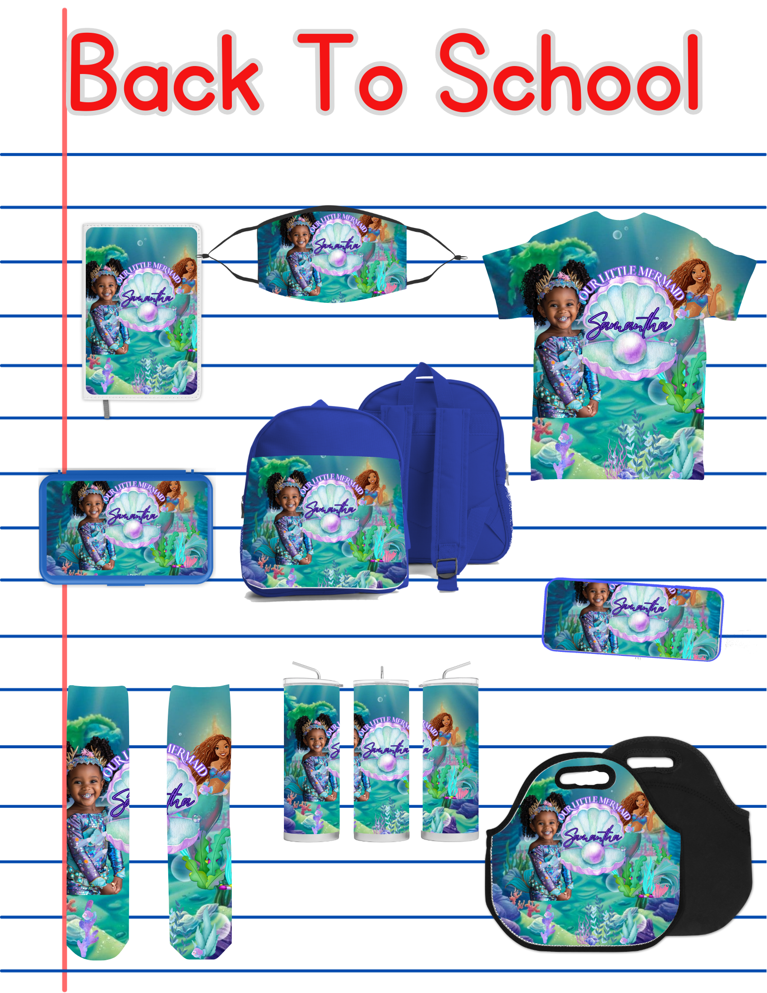 Dive into a world of enchantment with this beautiful Little Mermaid editable template, perfect for creating personalized kids' gear. Featuring beloved characters from the classic tale, this template is ideal for customizing backpacks, lunchboxes, shirts, face masks, and more. Easily personalize the design with your child's name and photo using Canva, the intuitive online design platform. Please note that reselling the template itself is prohibited, but you are free to use it to create physical products for commercial sale.