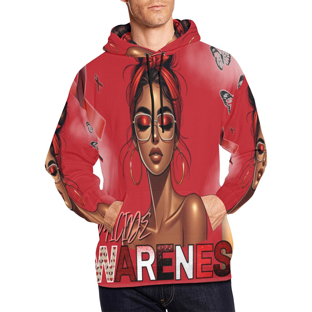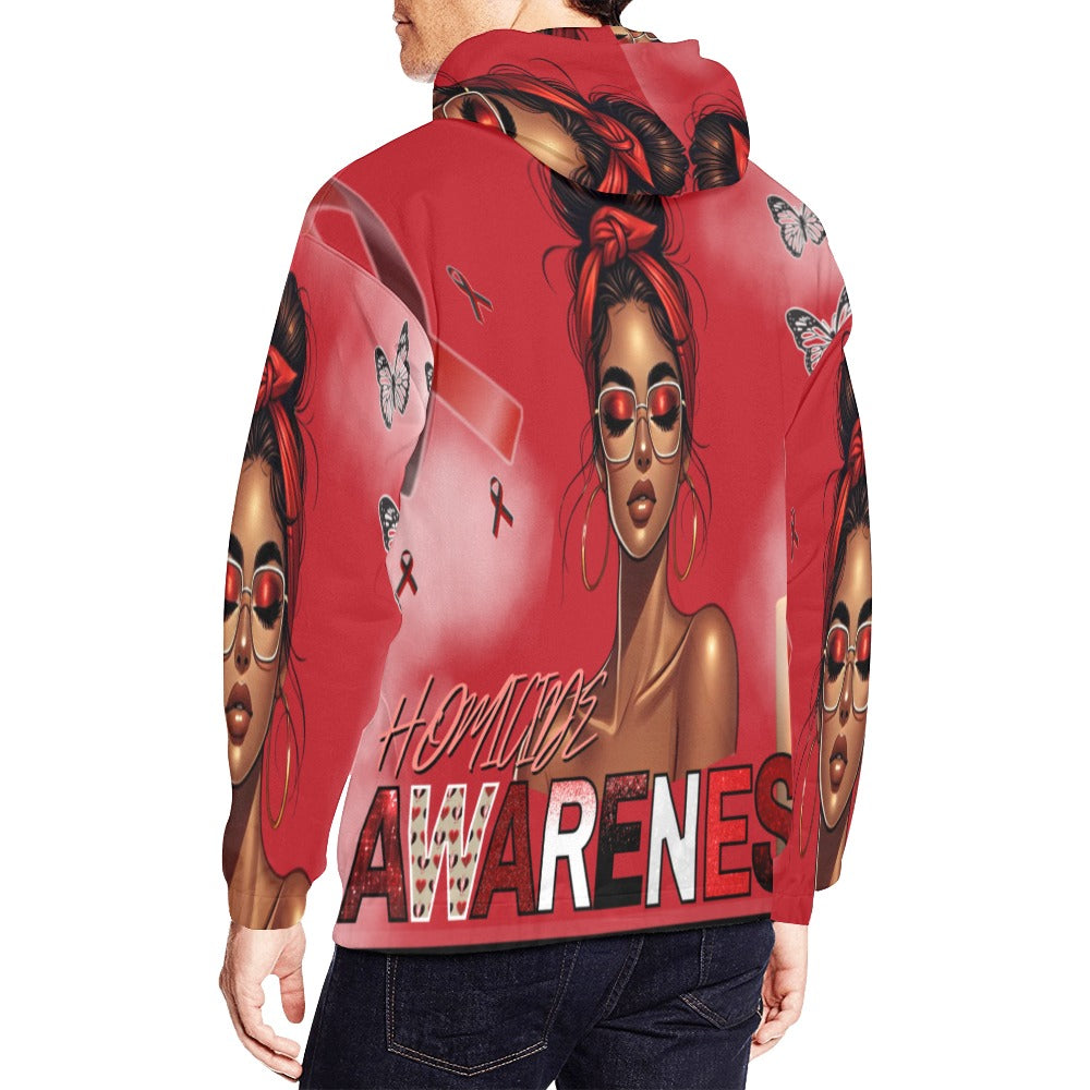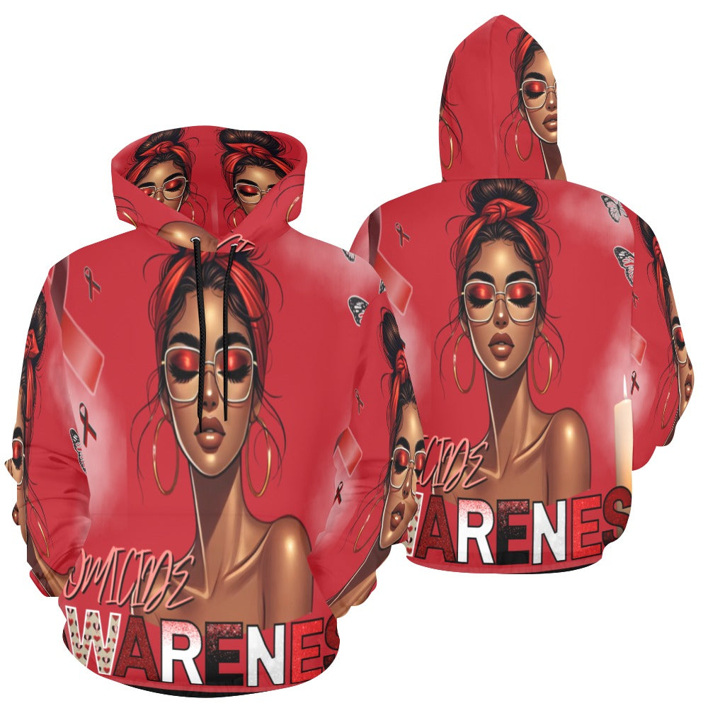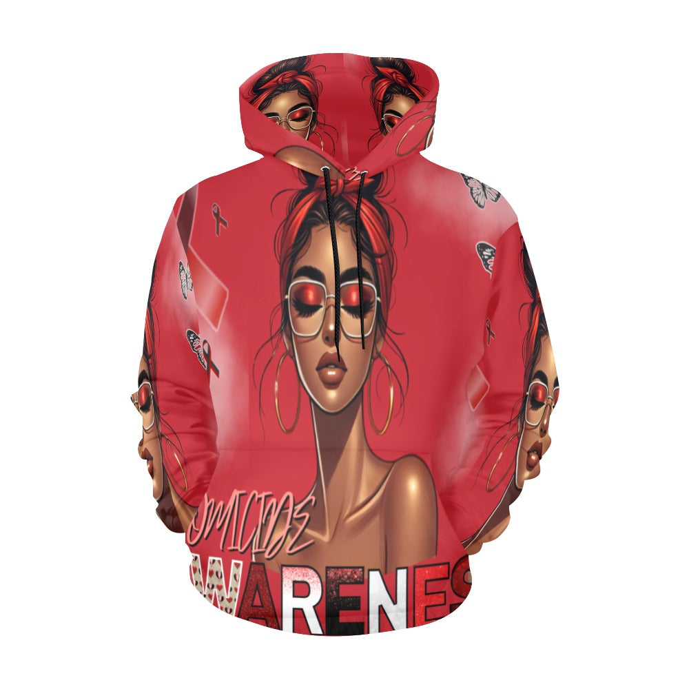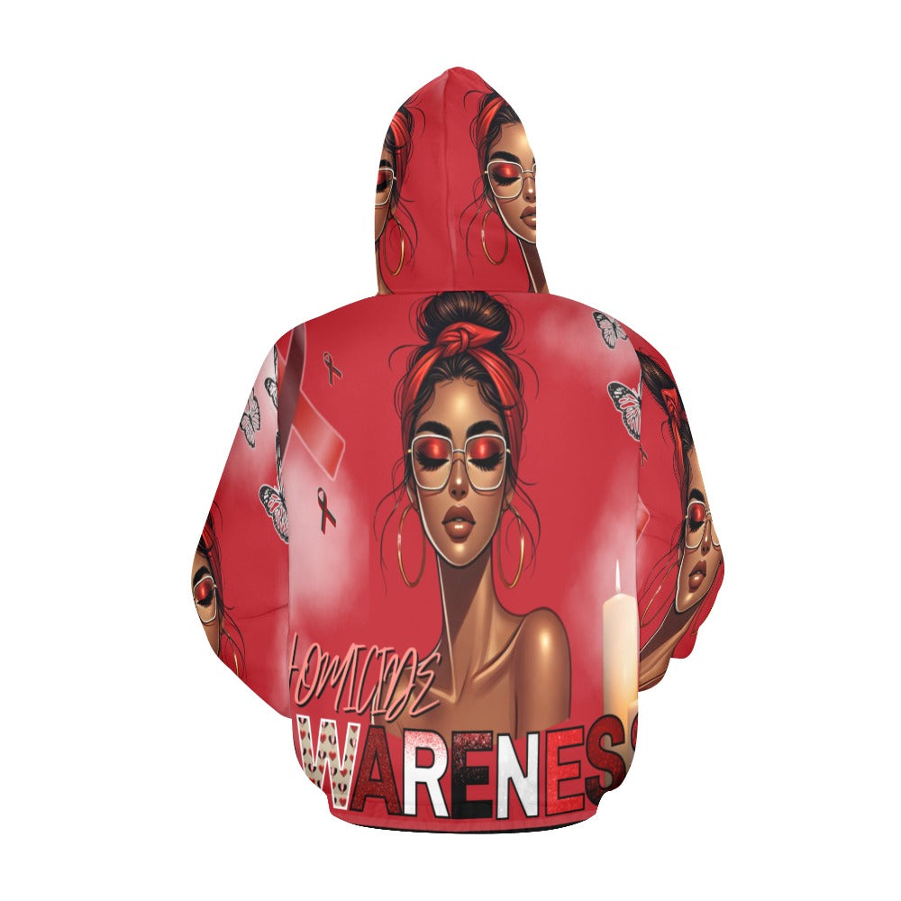 Designed with a striking and bold all-over print, this hoodie features a strong, resilient woman surrounded by symbols of remembrance—a reminder that we must never forget those who have been taken from us too soon. The deep red tones and powerful imagery make this hoodie not just a piece of apparel but a conversation starter about the importance of acknowledging and addressing homicide in our society.