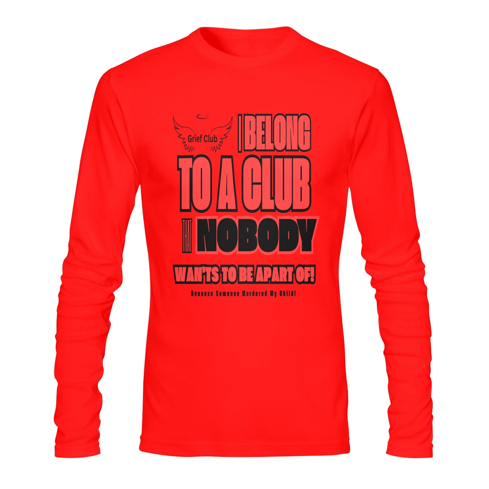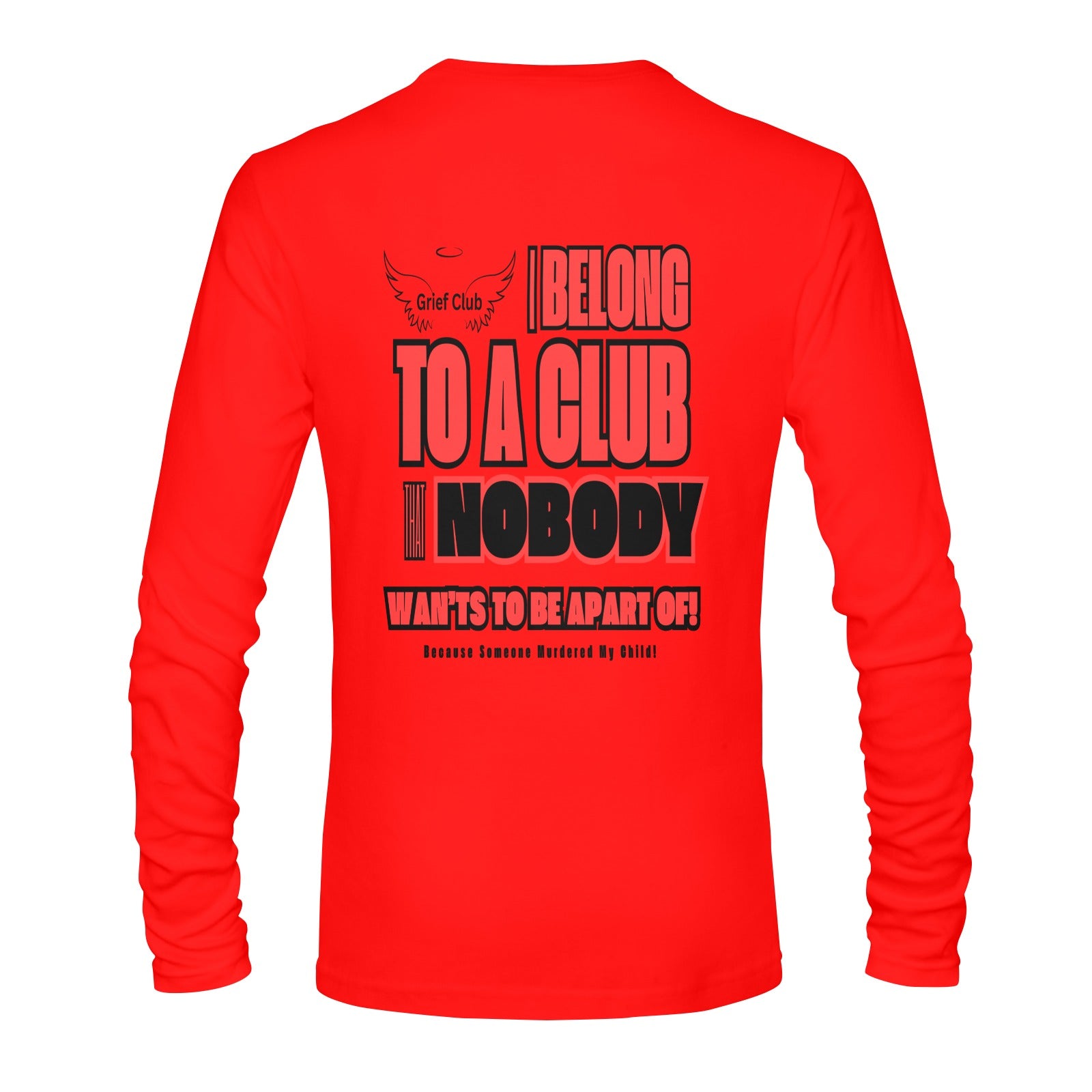 This men's long-sleeve cotton shirt is designed to bring awareness to the heartbreaking reality of losing a child to homicide. Boldly printed on both the front and back, the message reads, "I belong to a club that nobody wants to be apart of – Because someone murdered my child." The text is accompanied by the Grief Club’s signature angel wings and halo, a symbol of remembrance and eternal love. The vivid red color of the shirt and the striking black print serve as a powerful statement, ensuring that the message is visible from any angle. Made from soft, high-quality cotton, this shirt offers comfort and durability, making it ideal for raising awareness at events or as an everyday reminder of your child's memory. This long-sleeve shirt is a meaningful way to express grief, share your story, and connect with others who understand this unimaginable loss.