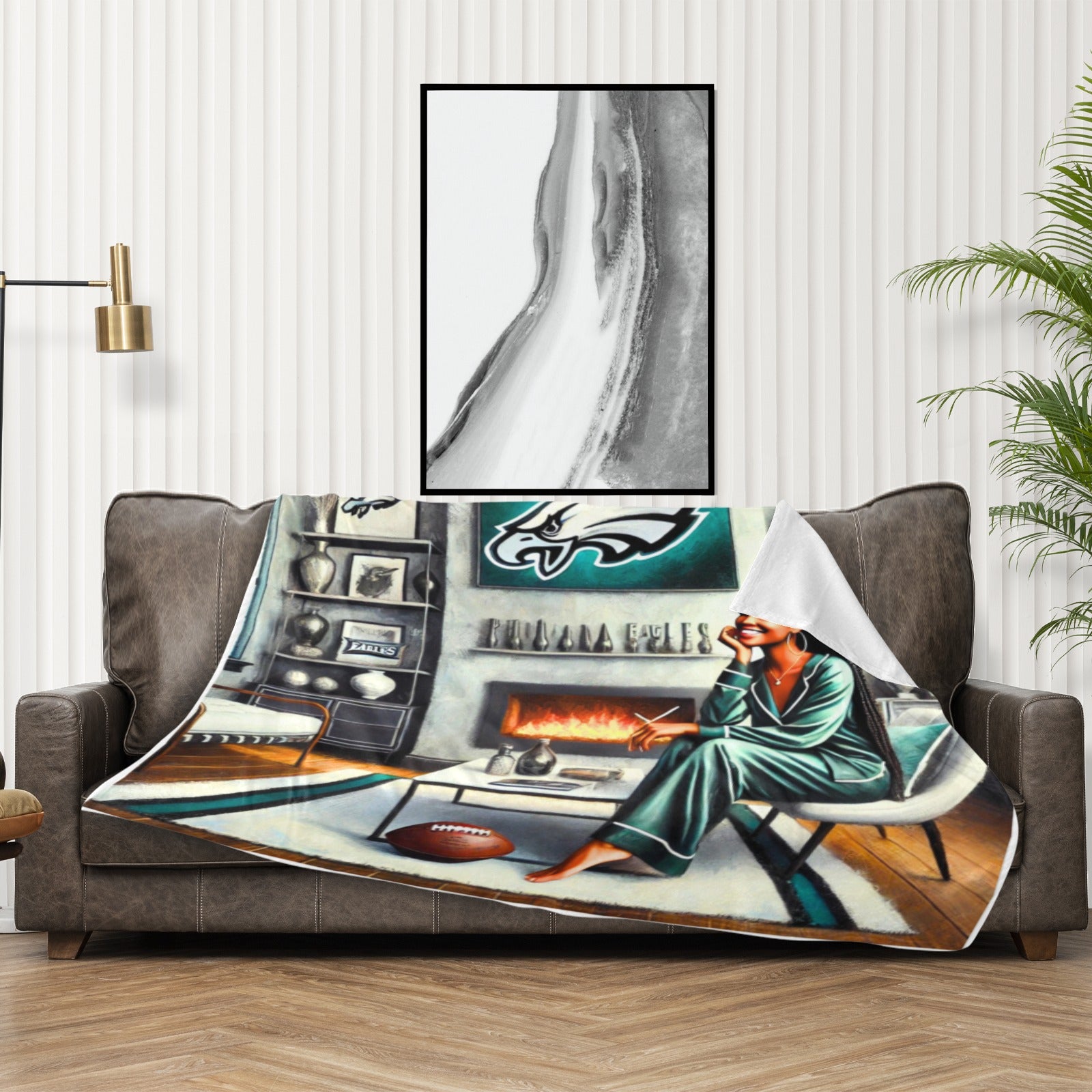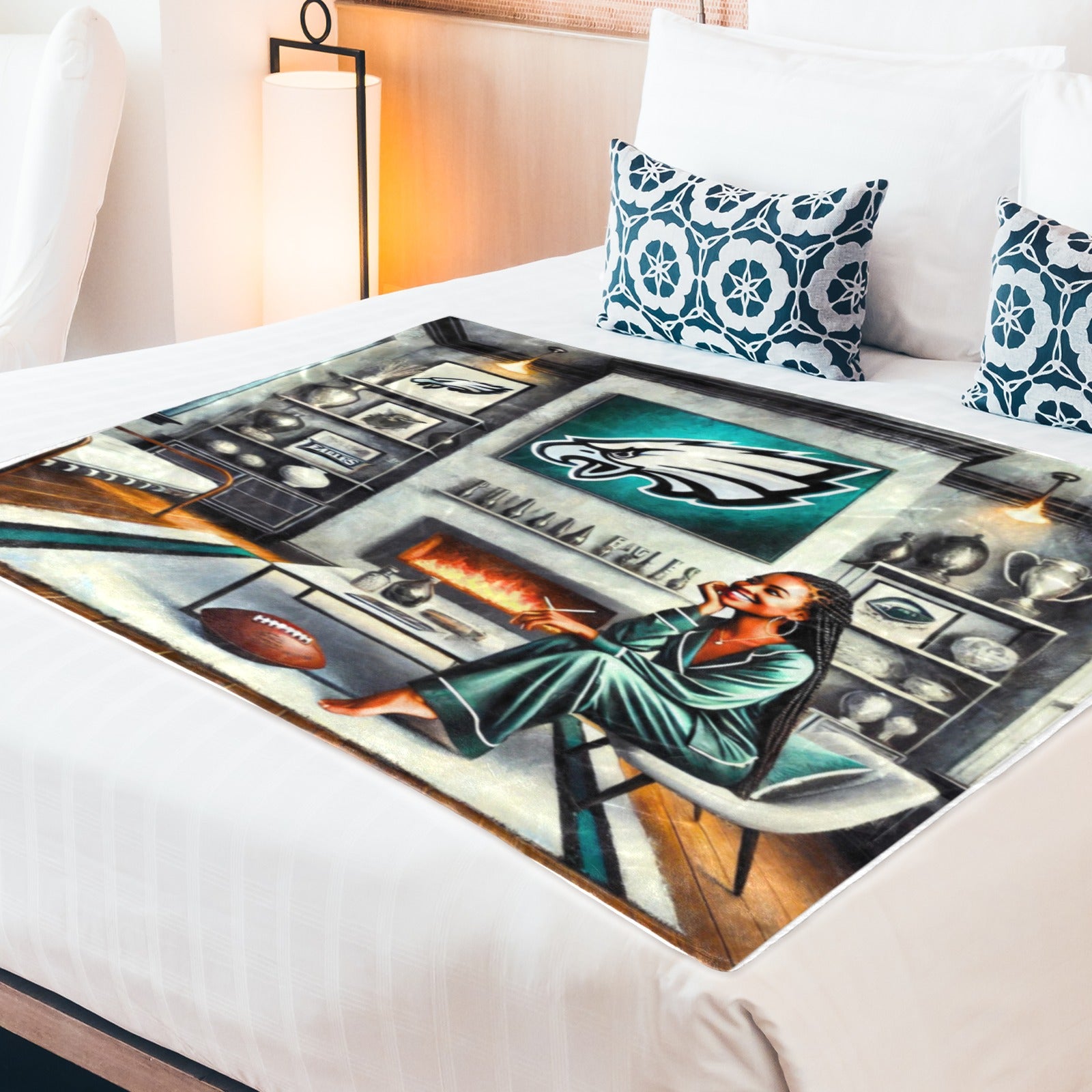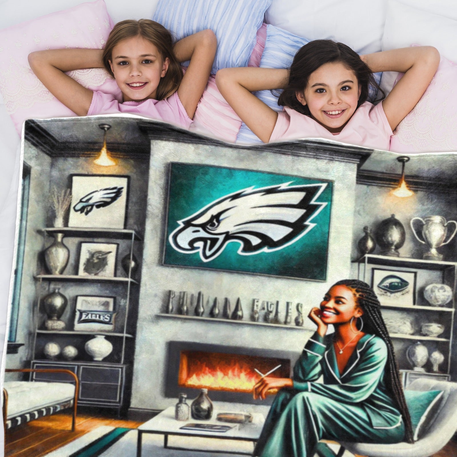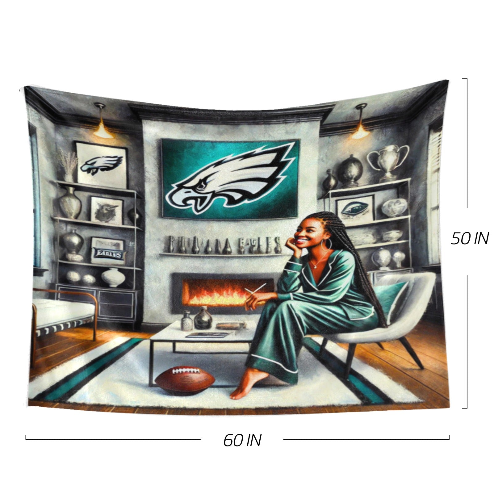 Celebrate your love for the Philadelphia Eagles with this ultra-soft micro fleece blanket. Measuring 60"x50", it showcases a vibrant design featuring the Eagles logo in a cozy, fan-themed setting. Crafted from premium polyester flannel, this blanket is lightweight yet warm, perfect for game day tailgates, watching football at home, or adding a spirited touch to your living space.