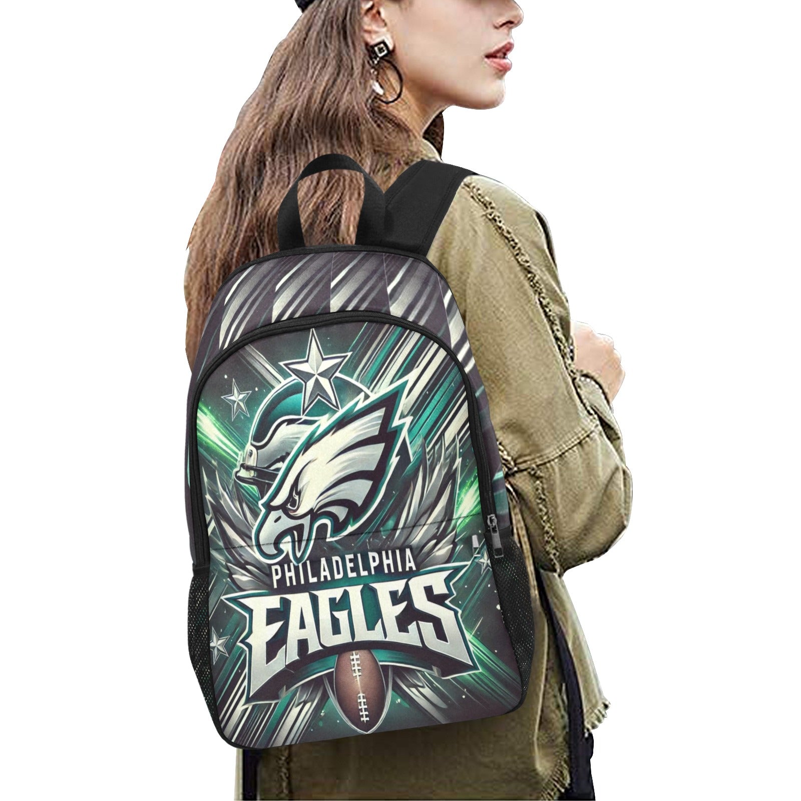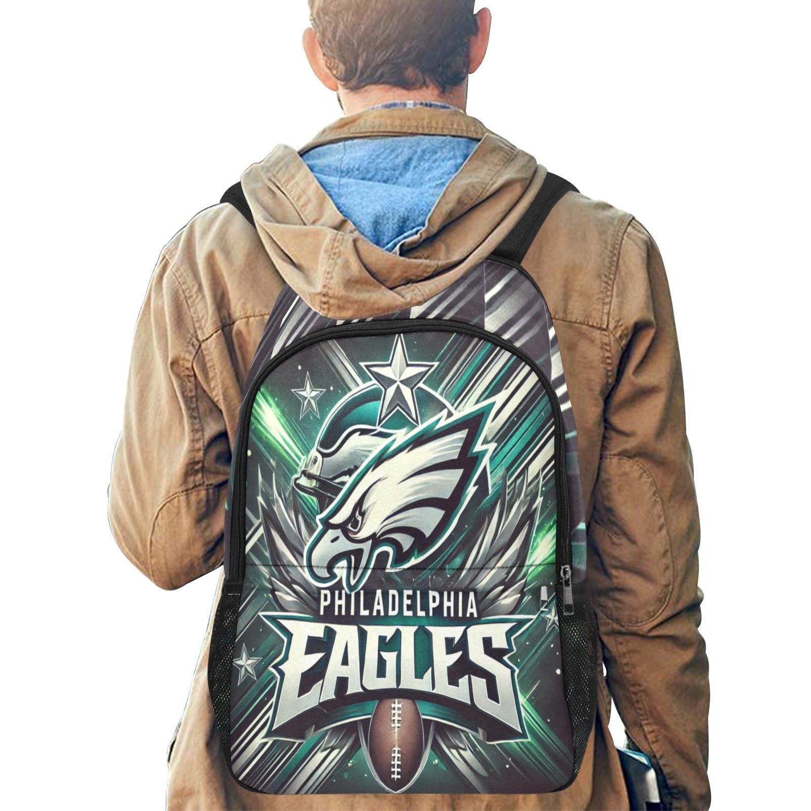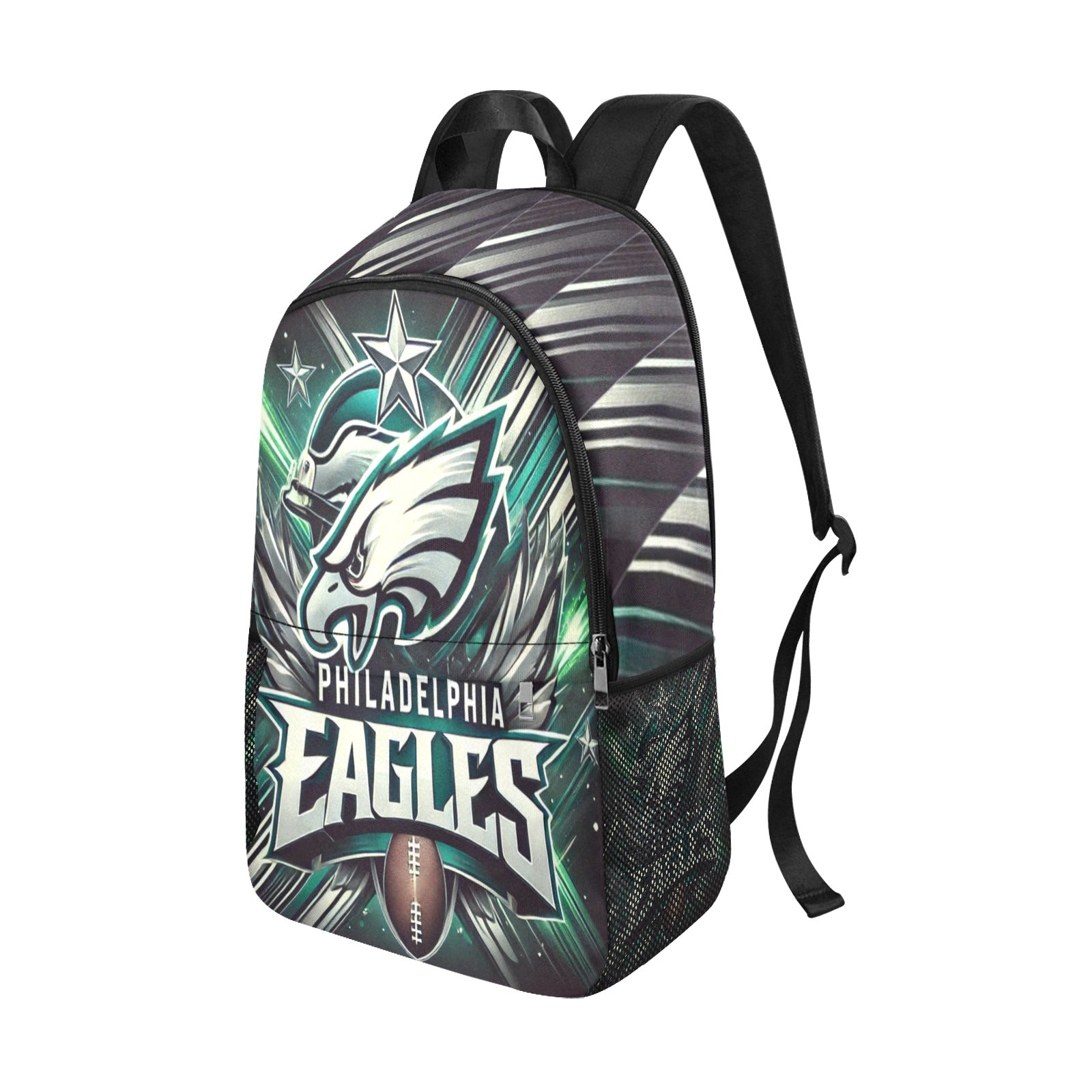 Show off your Eagles pride with this vibrant Philadelphia Eagles-themed backpack, perfect for fans on the go. Crafted from durable 1200D nylon, this lightweight yet robust backpack offers ample storage for your essentials. Its main compartment features a large zipper opening with an inner pocket for added organization, while the front pocket and back zipper compartment provide space for your laptop and other accessories. Two side mesh pockets are ideal for water bottles or umbrellas, ensuring convenience throughout the day. The padded back panel and adjustable shoulder straps enhance comfort and stability, making it suitable for school, work, or casual travel. The bold Eagles logo and football graphic add a stylish touch that’s sure to stand out!