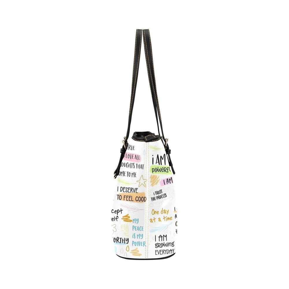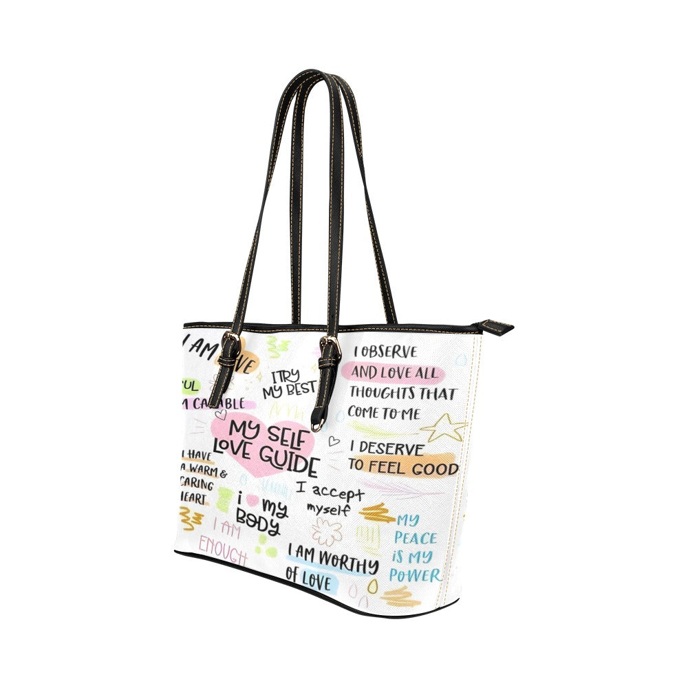 Carry positivity wherever you go with this self-love affirmation tote bag. Featuring a chic and empowering design adorned with uplifting messages like "I am powerful" and "I am enough," this tote is a daily reminder to prioritize self-love and confidence. Made from durable PU leather, it includes a spacious main compartment, an inner zippered pocket, and two slip pockets to keep your essentials organized. Stylish and functional, this tote is perfect for work, travel, or self-care routines.