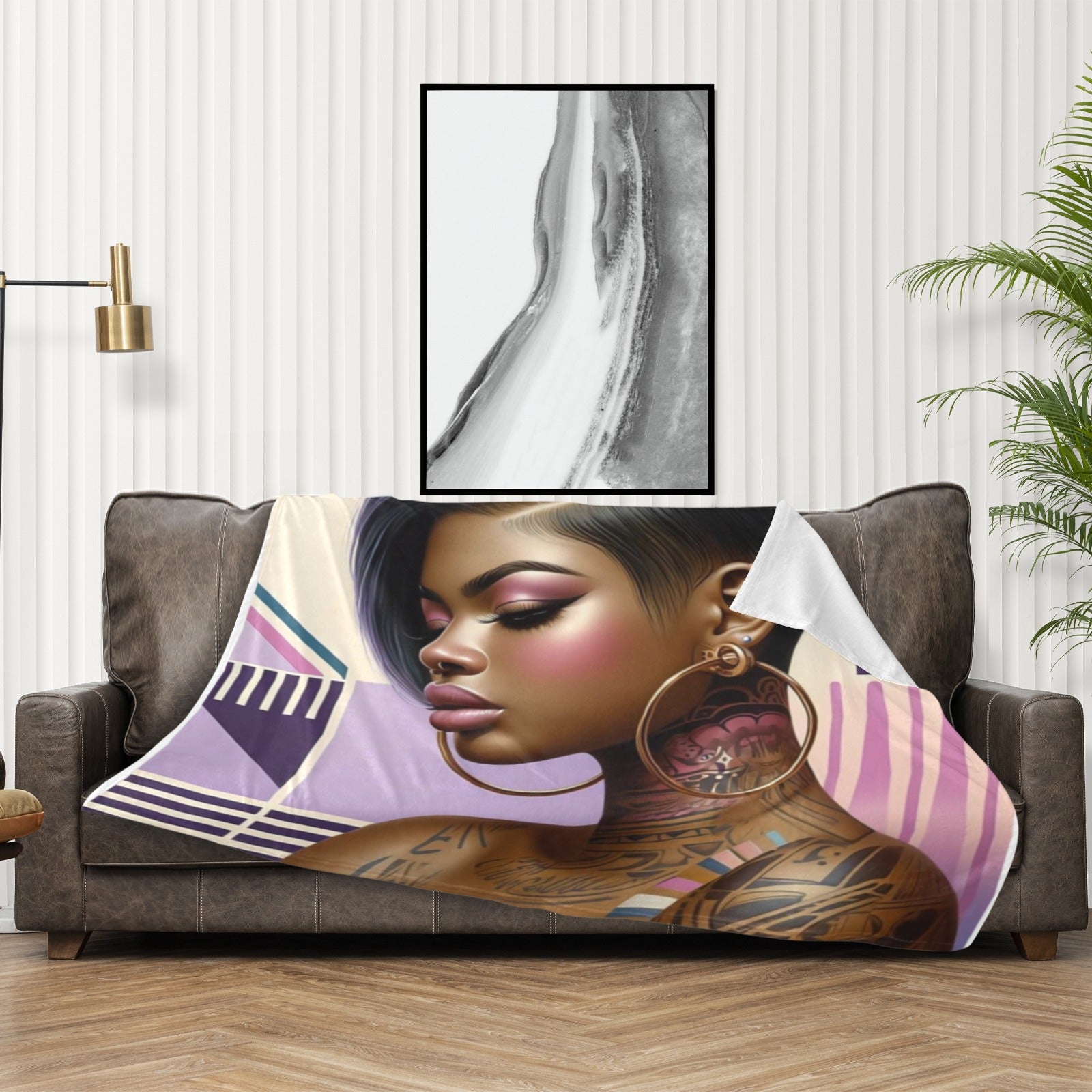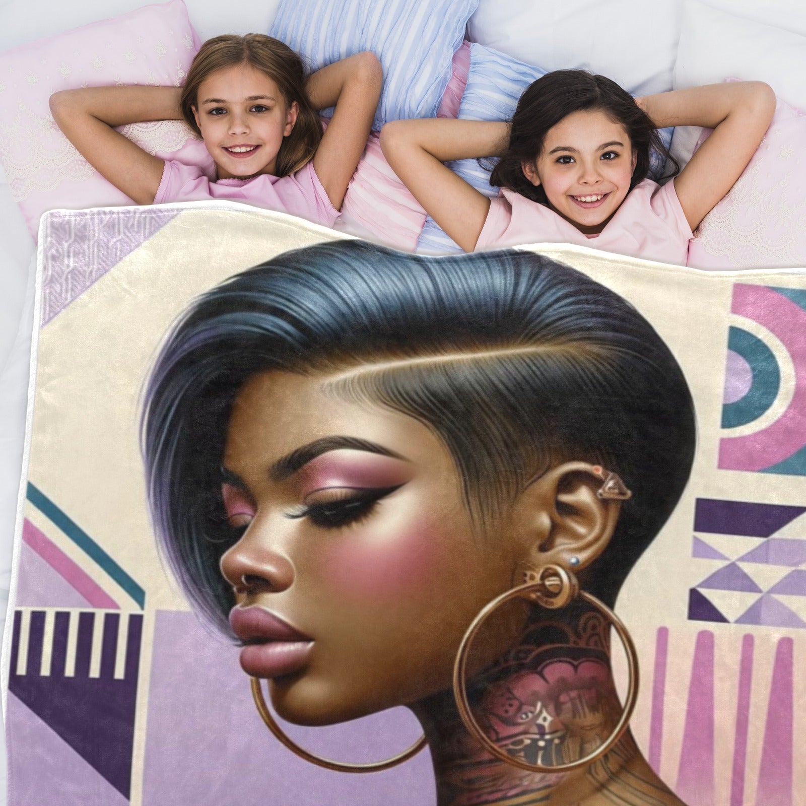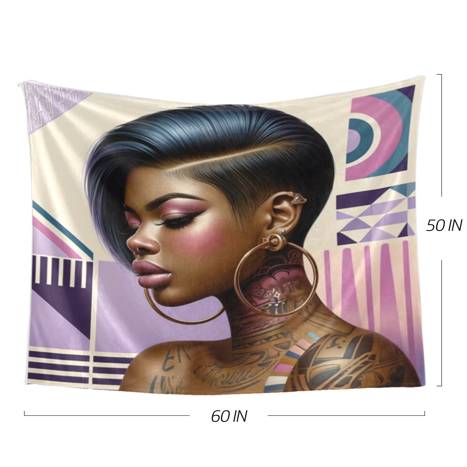 This exquisite 60x50-inch throw blanket features a bold and contemporary portrait of a woman adorned with intricate tattoos and vibrant gold hoop earrings. The design is beautifully accented with geometric shapes and soft pastel hues of pink and purple, creating a modern yet sophisticated aesthetic. Crafted from 100% polyester flannel, this blanket is luxuriously soft, lightweight, and durable, ensuring optimal warmth and comfort. The one-sided printing process delivers a high-quality, no-fade finish that maintains its stunning color vibrancy over time.