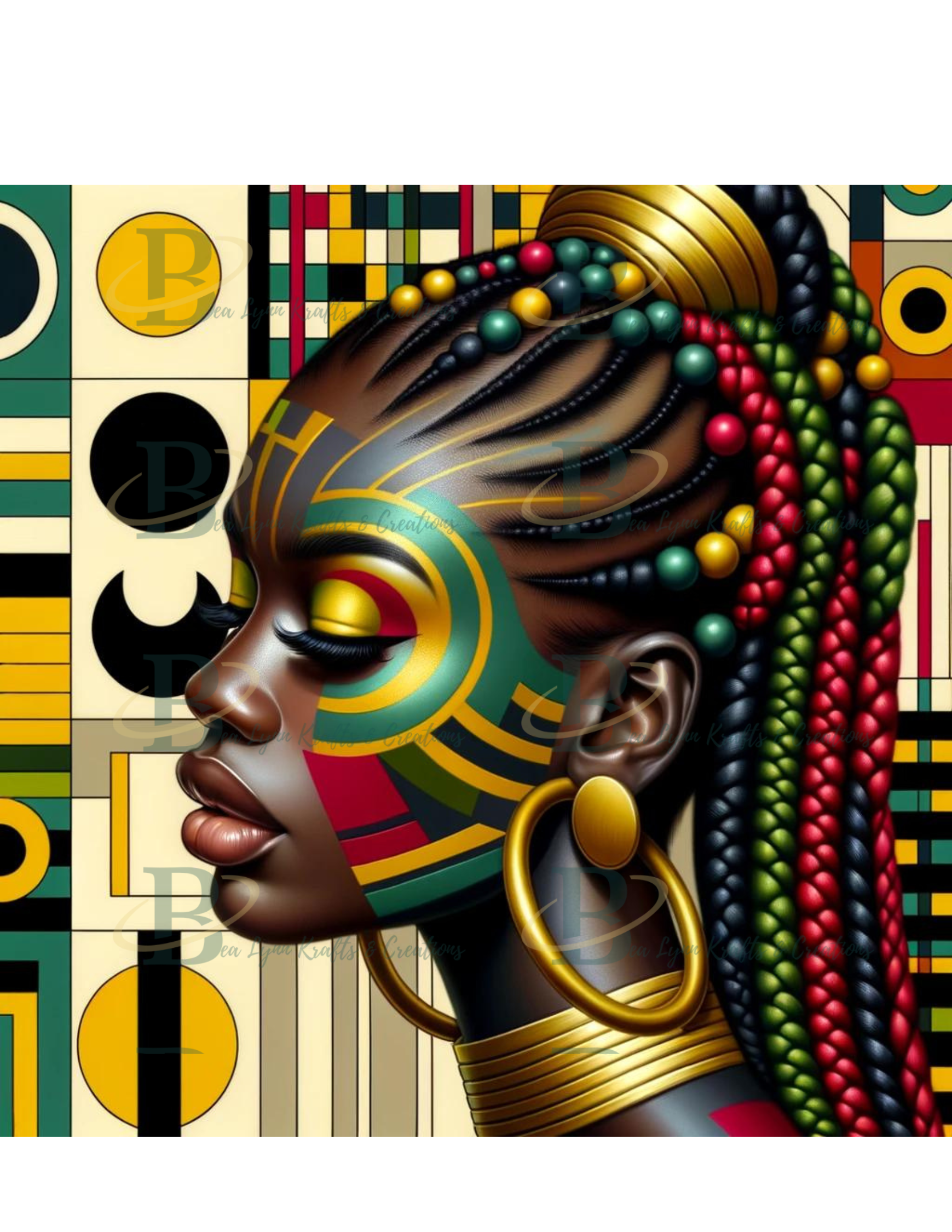 This striking digital oil painting portrays an African American woman adorned with bold, geometric face and neck patterns in vibrant hues of yellow, green, and red. Her hair is meticulously styled into intricate cornrows and braids, culminating in a prominent, high bun accented with bright red braids and gold. She wears large, ornate gold hoop earrings that complement her regal and graceful demeanor. Her serene expression, with closed eyes and slightly parted lips, exudes a sense of calm and inner strength. The abstract geometric background features a dynamic mix of black, yellow, red, and green shapes, creating a visually stimulating and harmonious composition. This artwork seamlessly blends modern abstract elements with traditional African aesthetics, celebrating the woman's unique beauty and rich cultural heritage.