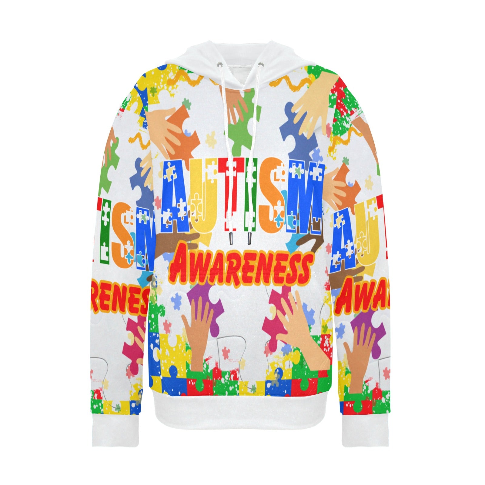 Celebrate unity, diversity, and inclusion with this vibrant Autism Awareness women's fleece hoodie. The bold all-over print showcases the powerful word "Autism" in colorful puzzle pieces, a universal symbol of autism awareness, surrounded by raised hands in various shades representing different races and cultures. These hands symbolize a global community coming together to support, embrace, and understand those on the autism spectrum, reinforcing the message that awareness is a shared responsibility.
