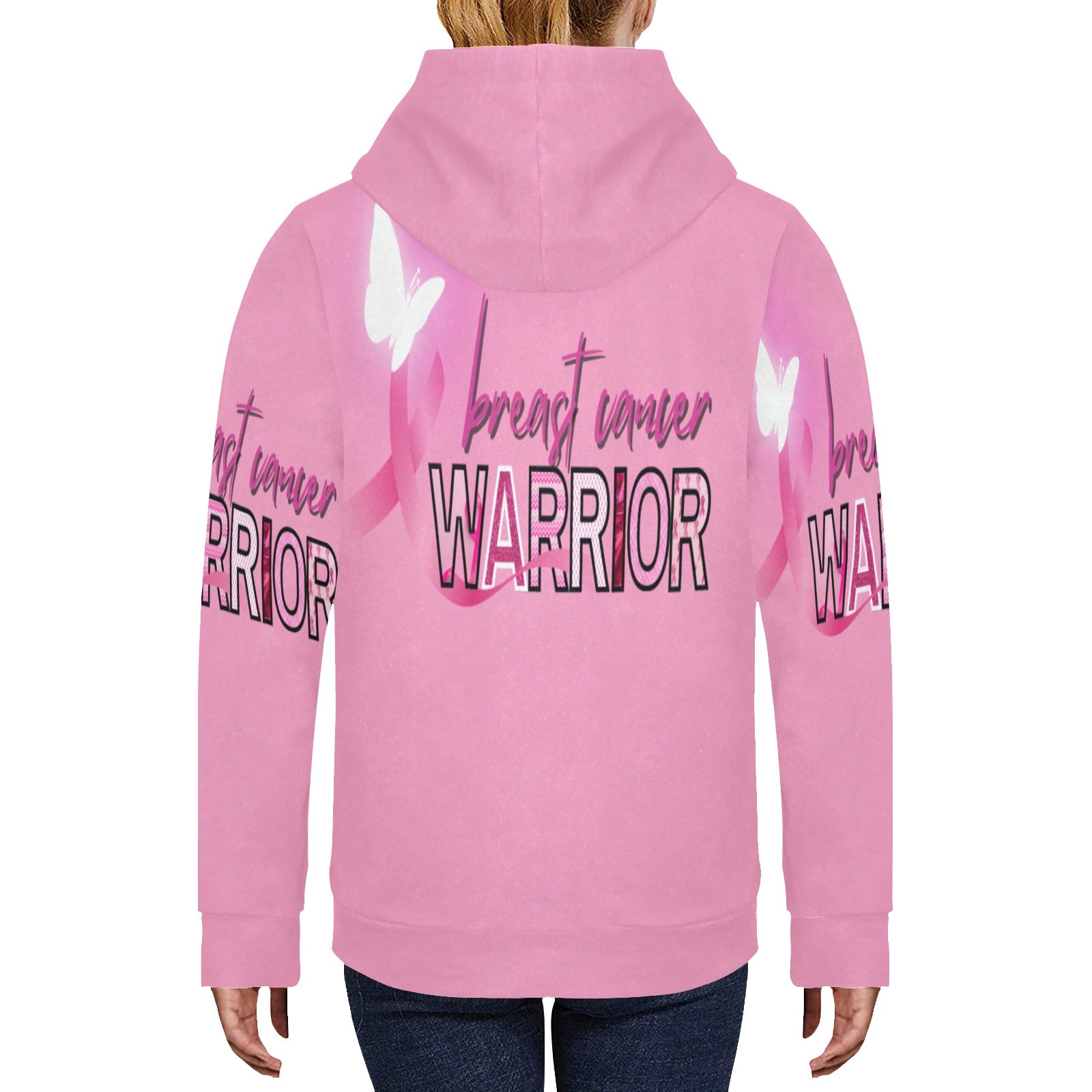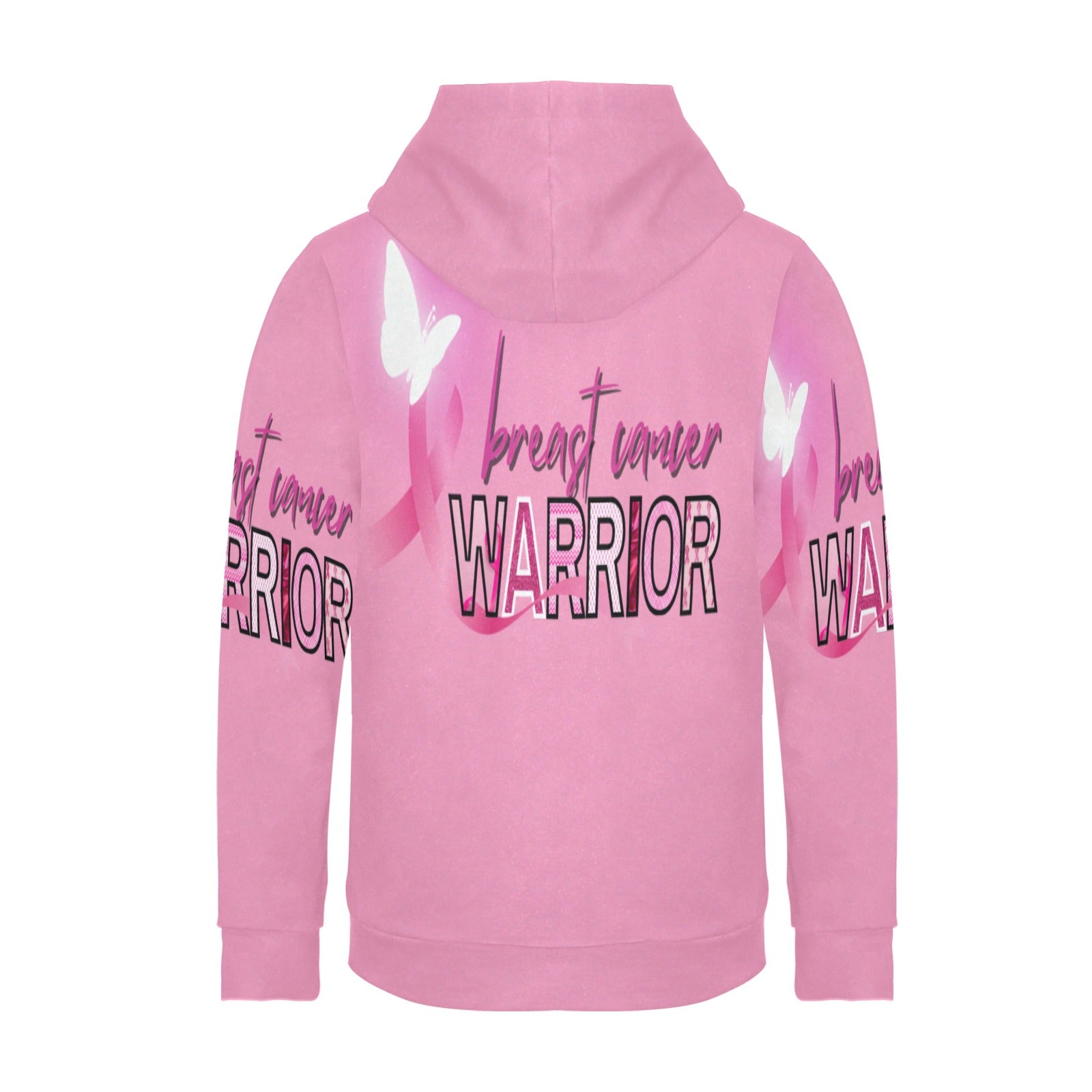 This women's all-over print hoodie is a tribute to strength, courage, and resilience in the face of breast cancer. Featuring a powerful "Breast Cancer Warrior" design, this hoodie displays a pink awareness ribbon intertwined with elegant white butterflies, symbolizing hope and transformation. The vivid pink background radiates support and solidarity with those affected by breast cancer. Made from a soft, cozy fabric, this hoodie provides warmth and comfort, making it perfect for advocacy events or everyday wear. Whether you're fighting your own battle or supporting a loved one, this hoodie is a wearable message of empowerment and hope.