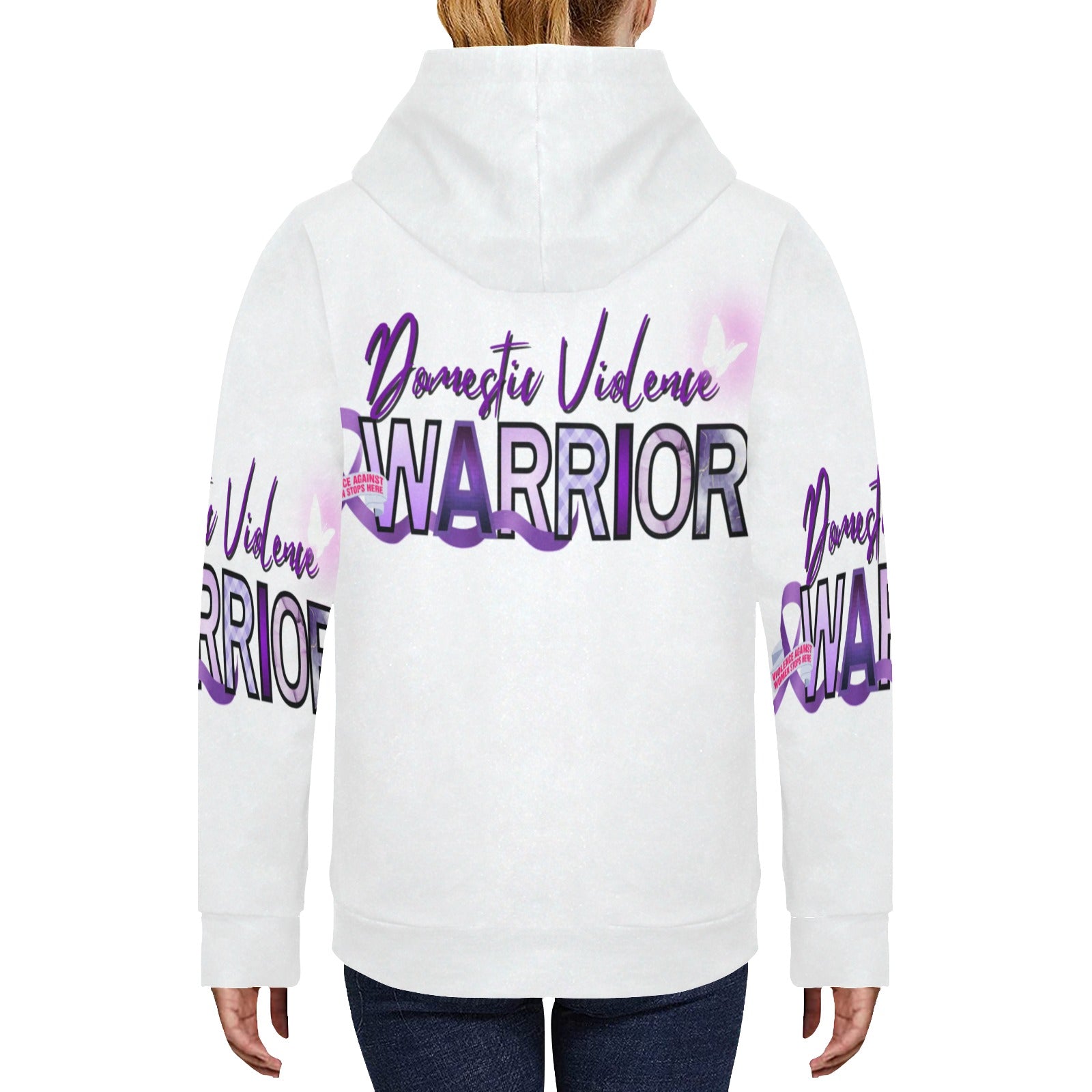 This Women's Domestic Violence Warrior Hoodie is designed for survivors, supporters, and advocates. Crafted from soft fleece, it offers both comfort and warmth. The hoodie features bold purple text, "Domestic Violence Warrior," with an intertwined purple awareness ribbon, symbolizing strength and support for domestic violence victims. A delicate white dove, symbolizing peace and hope, adds a subtle yet powerful touch to the design. Available in sizes from small to 2X, this hoodie is perfect for spreading awareness while staying stylish and cozy.