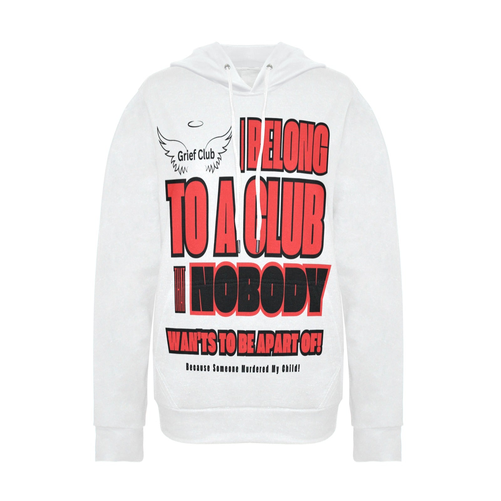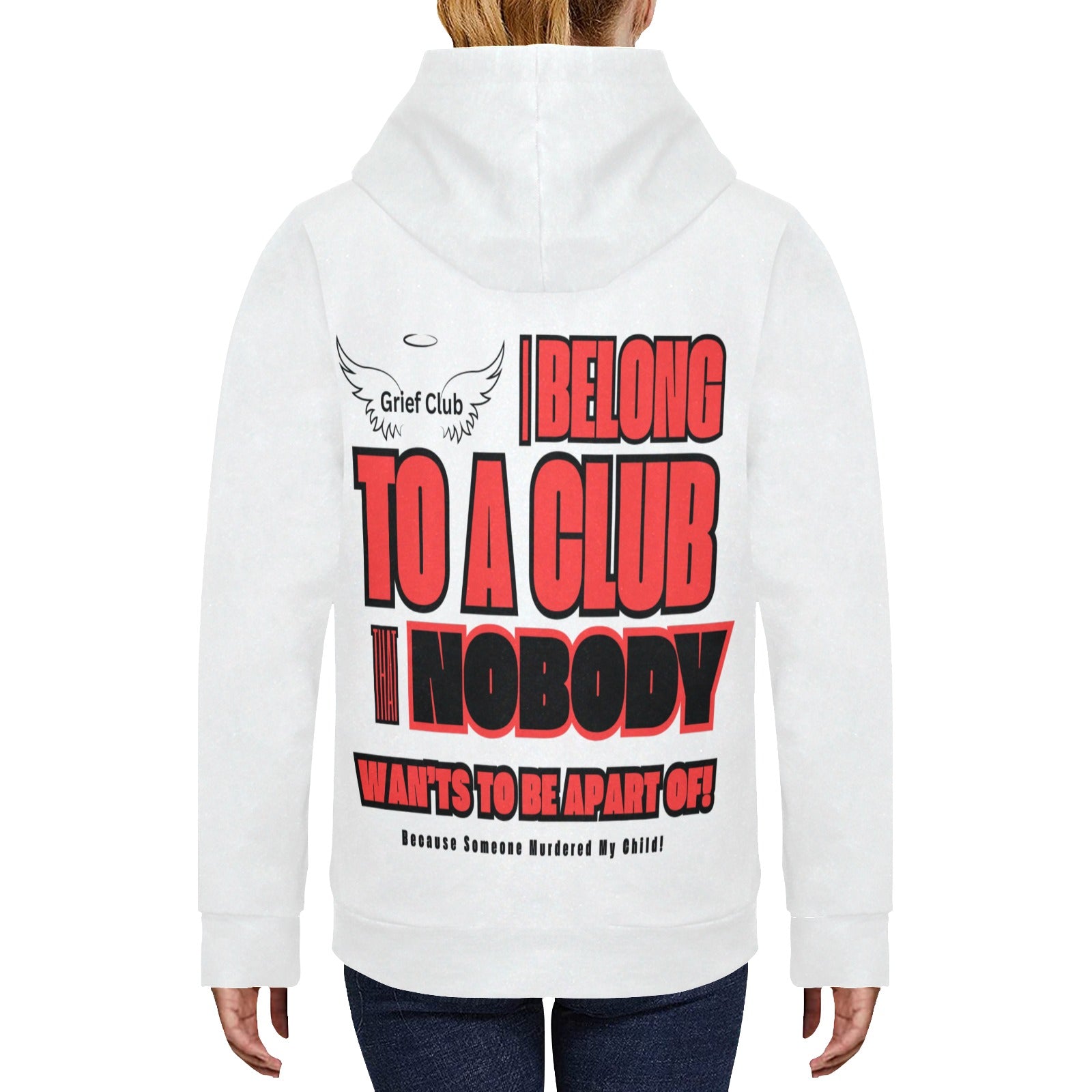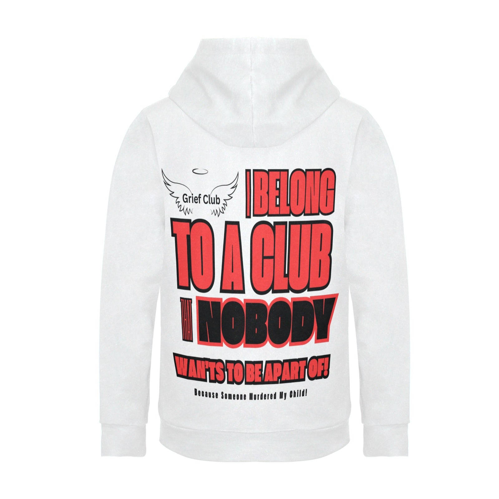 This women’s front and back print fleece hoodie is designed for those who have tragically lost a child to homicide, serving as both a memorial and a voice for raising awareness. The bold red and black message, "I belong to a club that nobody wants to be apart of – Because someone murdered my child," is printed on both the front and back, allowing the message to be visible from every angle. Accented by the Grief Club’s angel wings and halo symbol, the hoodie offers a blend of warmth, comfort, and emotional support, ideal for those who carry the weight of grief daily. Made from soft, high-quality fleece fabric, this hoodie provides a cozy feel while also offering a powerful reminder of solidarity and remembrance. It is perfect for colder days, whether you’re attending an awareness event or simply need a comfortable yet meaningful item of clothing to express your grief and honor your loved one.