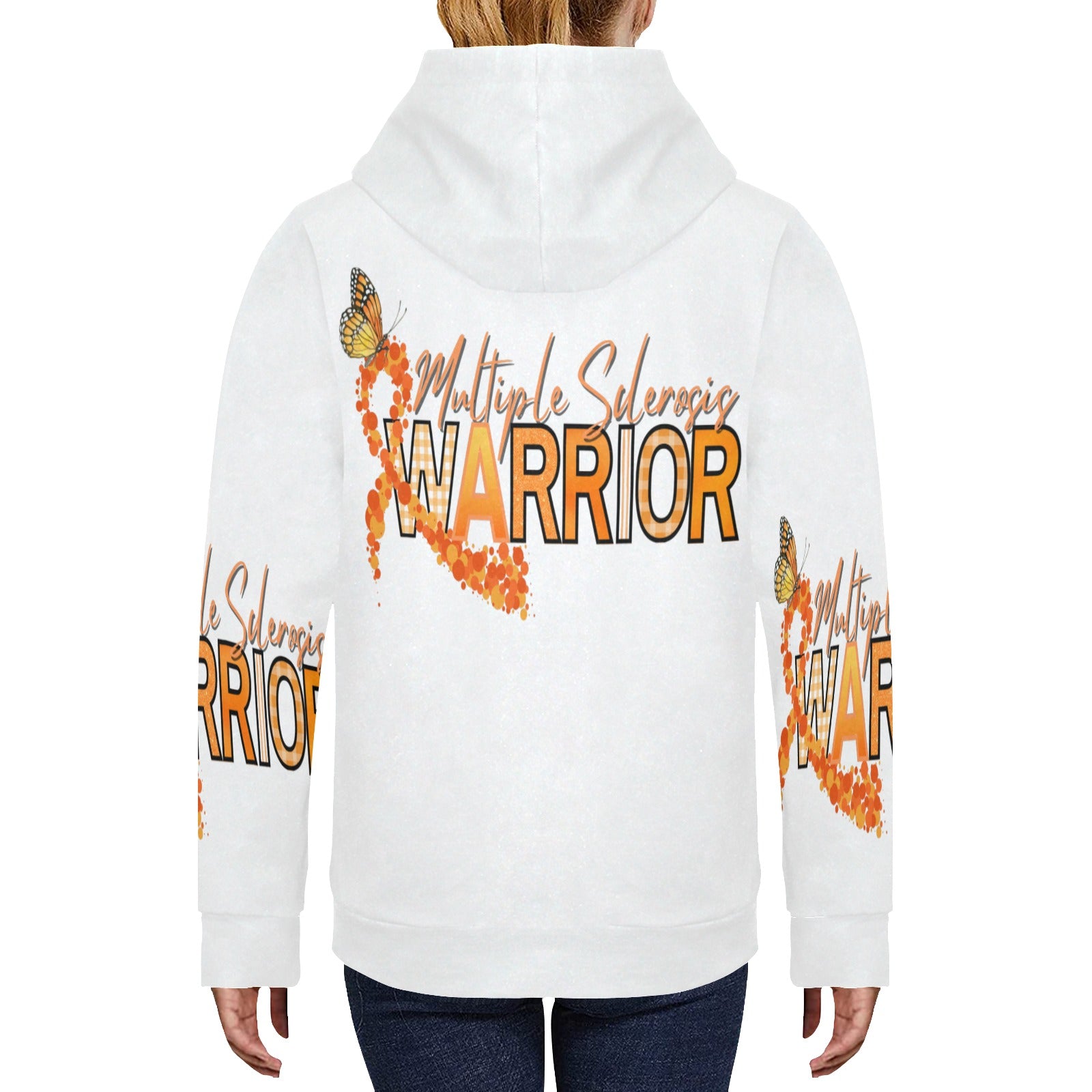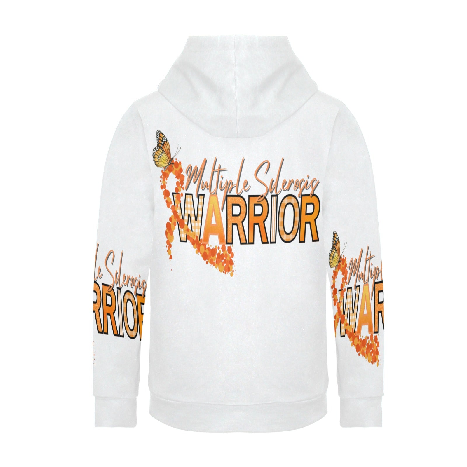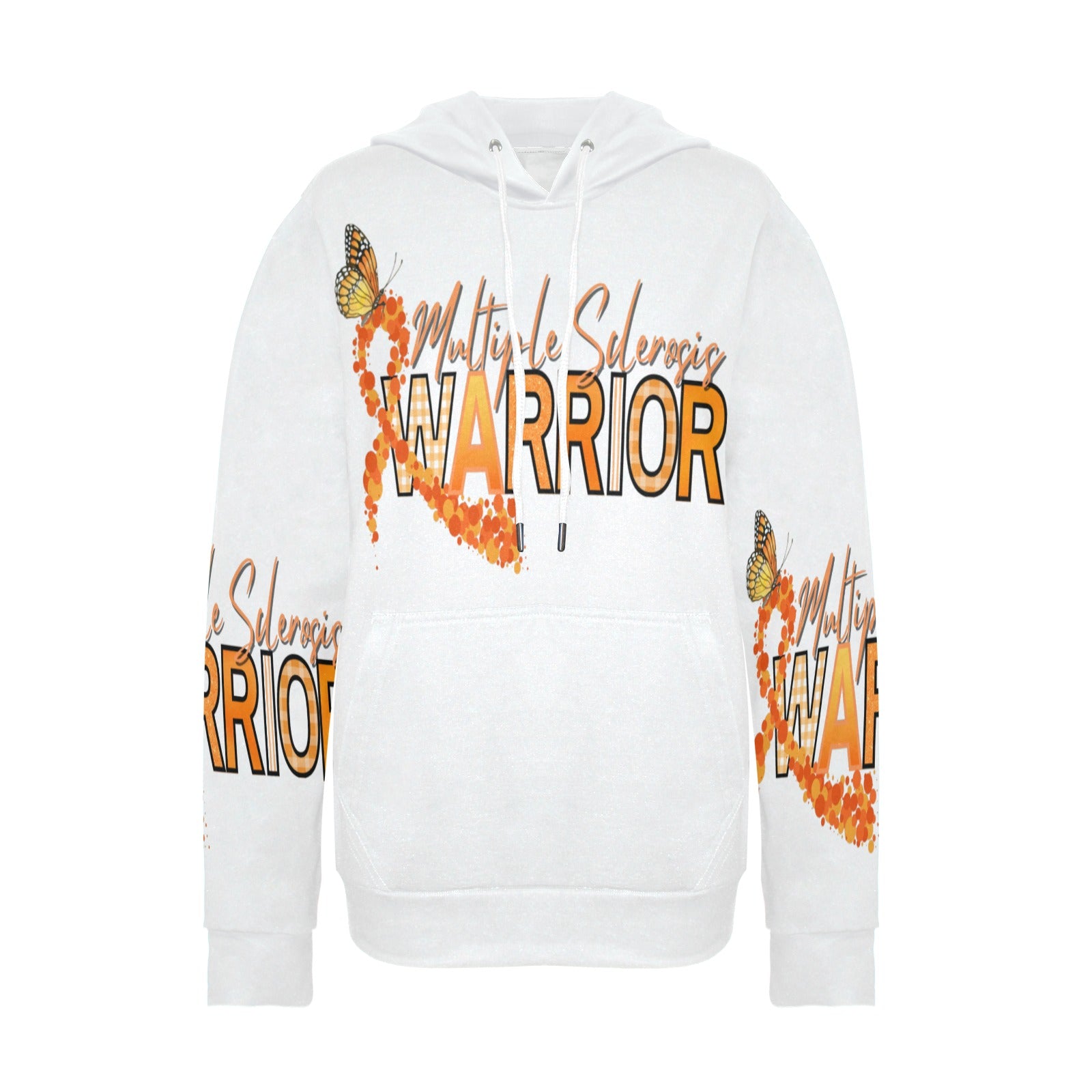 This women's fleece hoodie celebrates strength and resilience with a bold "Multiple Sclerosis Warrior" design. Displaying an orange awareness ribbon adorned with a scattering of butterflies, this hoodie symbolizes hope and transformation for those affected by MS. The all-over print makes a statement, while the soft fleece material ensures warmth and comfort, perfect for showing your support during MS awareness events or everyday wear. Whether you're advocating for yourself or a loved one, this hoodie helps spread awareness and empowers those in the fight against Multiple Sclerosis.