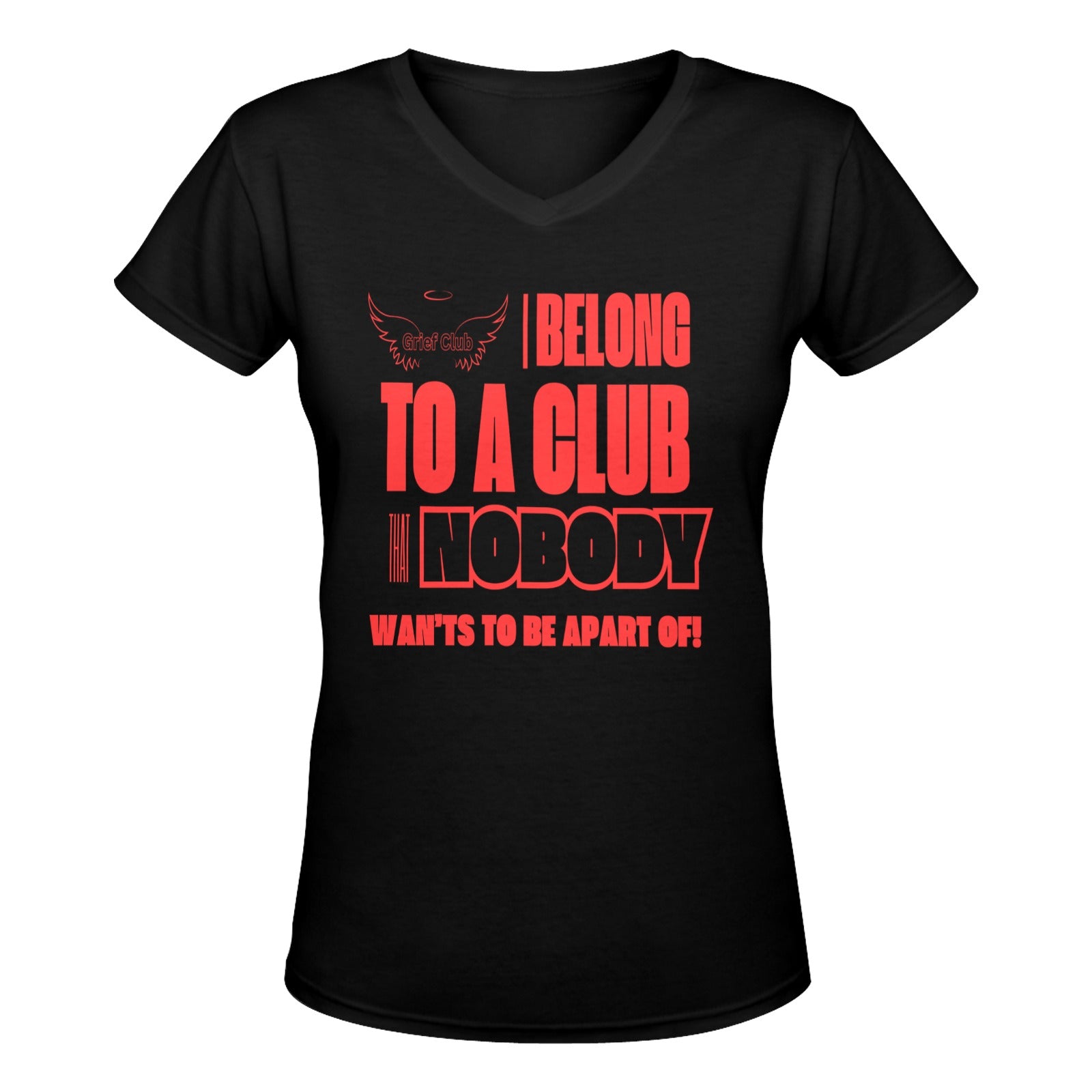 This women's V-neck t-shirt offers a bold yet heartfelt way to raise awareness about the devastating impact of losing a child to homicide. The powerful red and black text on the front reads, "I belong to a club that nobody wants to be apart of," accompanied by the Grief Club’s symbolic angel wings and halo. The shirt is designed to provide comfort while honoring the memory of a lost child and creating a visual statement that speaks to the pain and solidarity of grieving parents. Made from soft, high-quality fabric, this t-shirt ensures a comfortable, flattering fit while making the strong message visible. Ideal for awareness walks, events, or as a personal tribute, this V-neck style provides a simple but powerful way to express grief and connect with others who share the same experience.